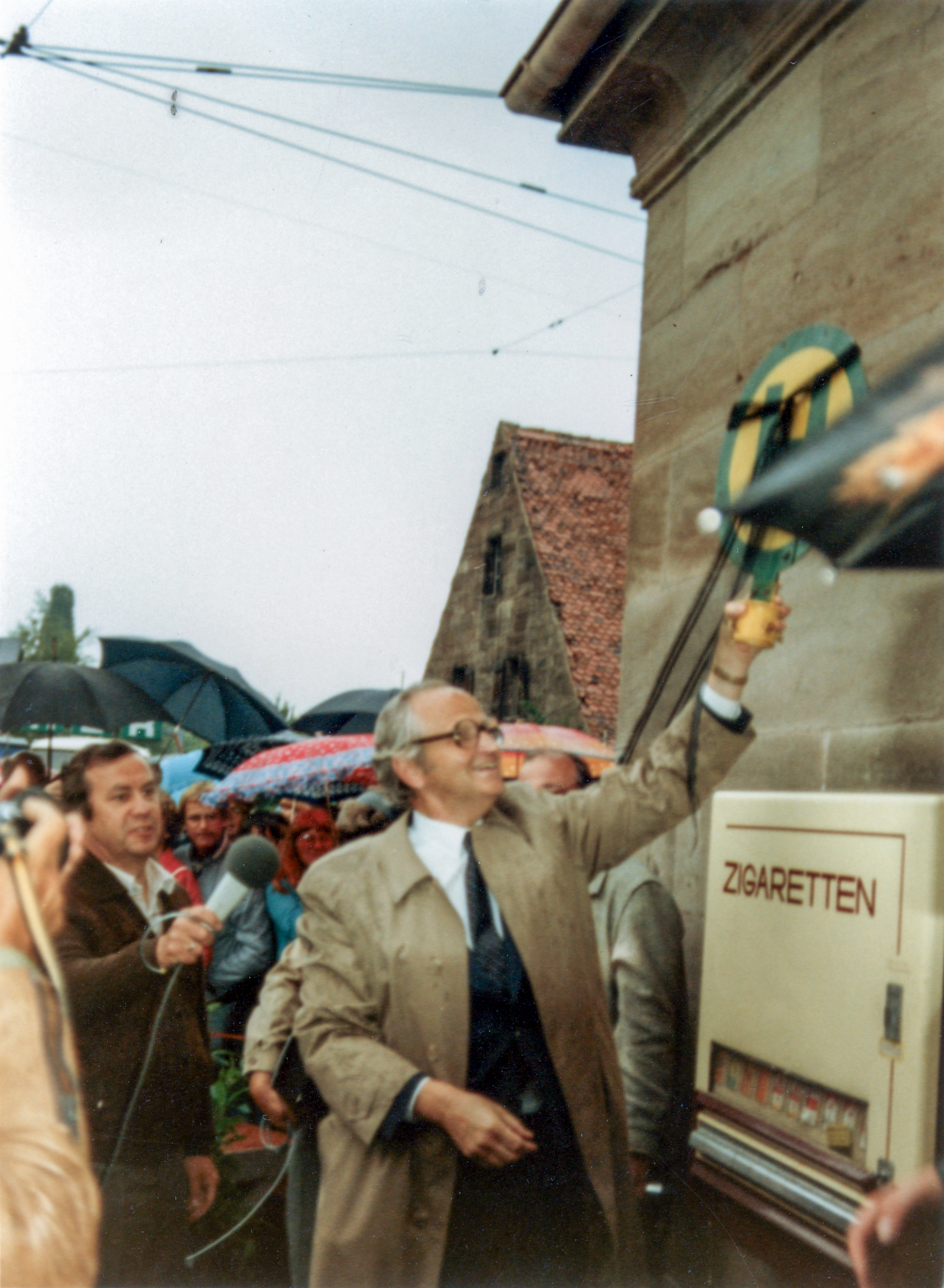 | Beschreibung | OB Scherzer bei der Veranstaltung zur letzten Fahrt der Straßenbahn in Fürth an der Billinganlage, 20. Juni 1981 | ||