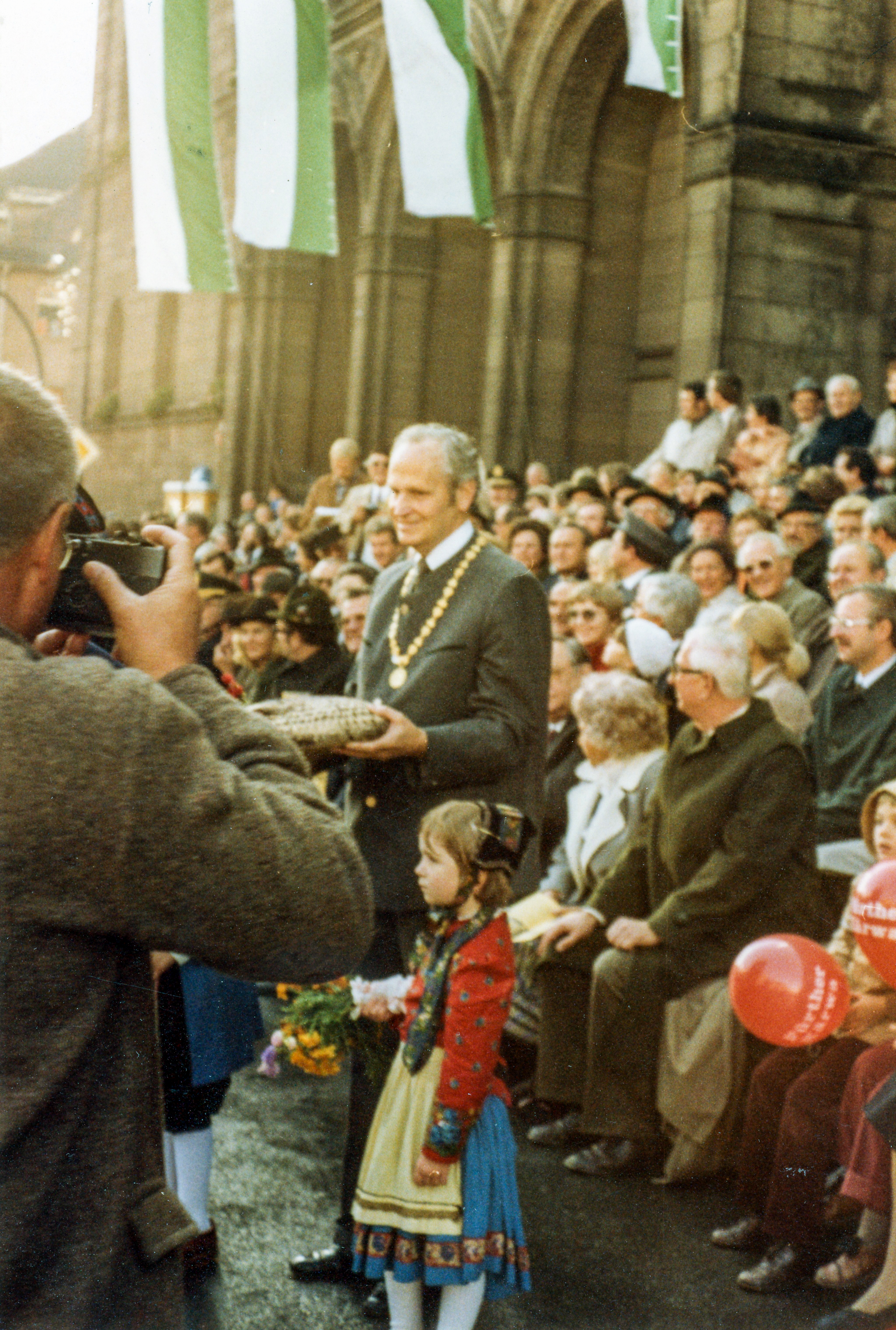 | Beschreibung | OB Kurt Scherzer am Bauernsonntag zur Michaeliskirchweih, Okt 1981 | ||