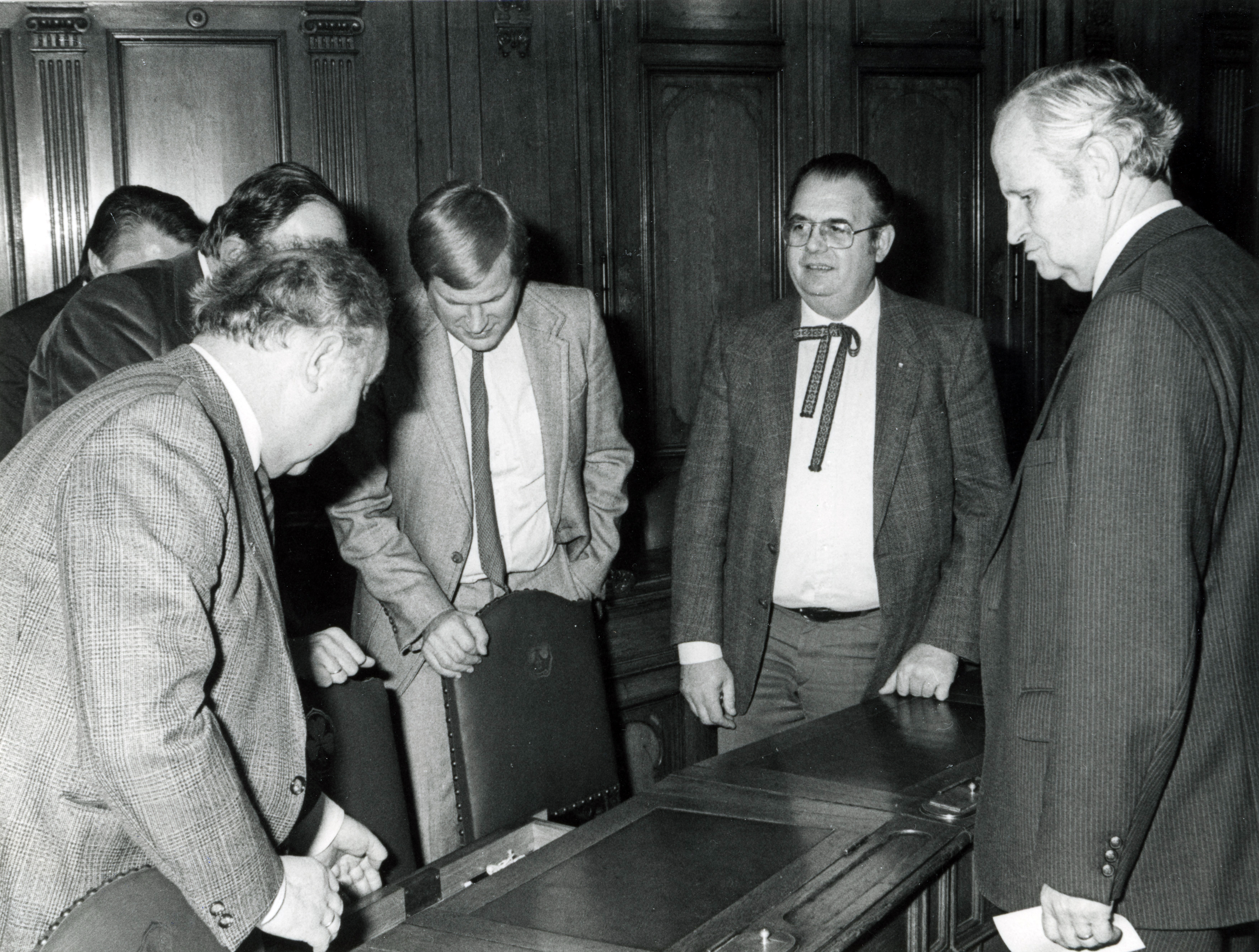 | Beschreibung | Stadträte im Sitzungsaal, v.r.n.l.: OB Scherzer; StR Schmidtbauer, StR Hefele, Nov 1983 | ||