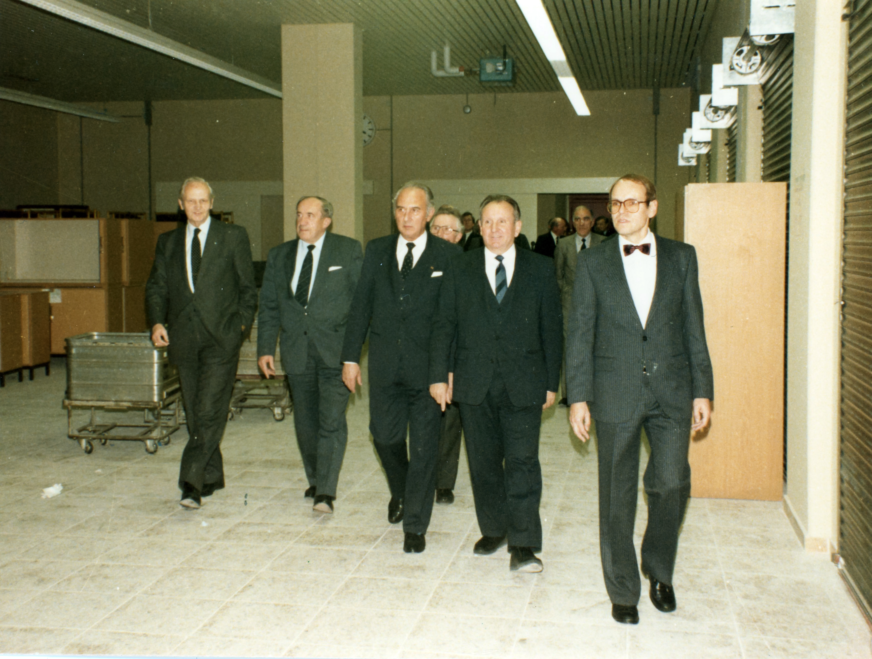 | Beschreibung | Begehung kurz vor der Einweihung der neuen Hauptpost am Bahnhofplatz mit Bundesminister Werner Dollinger und OB Scherzer, 1984 | ||