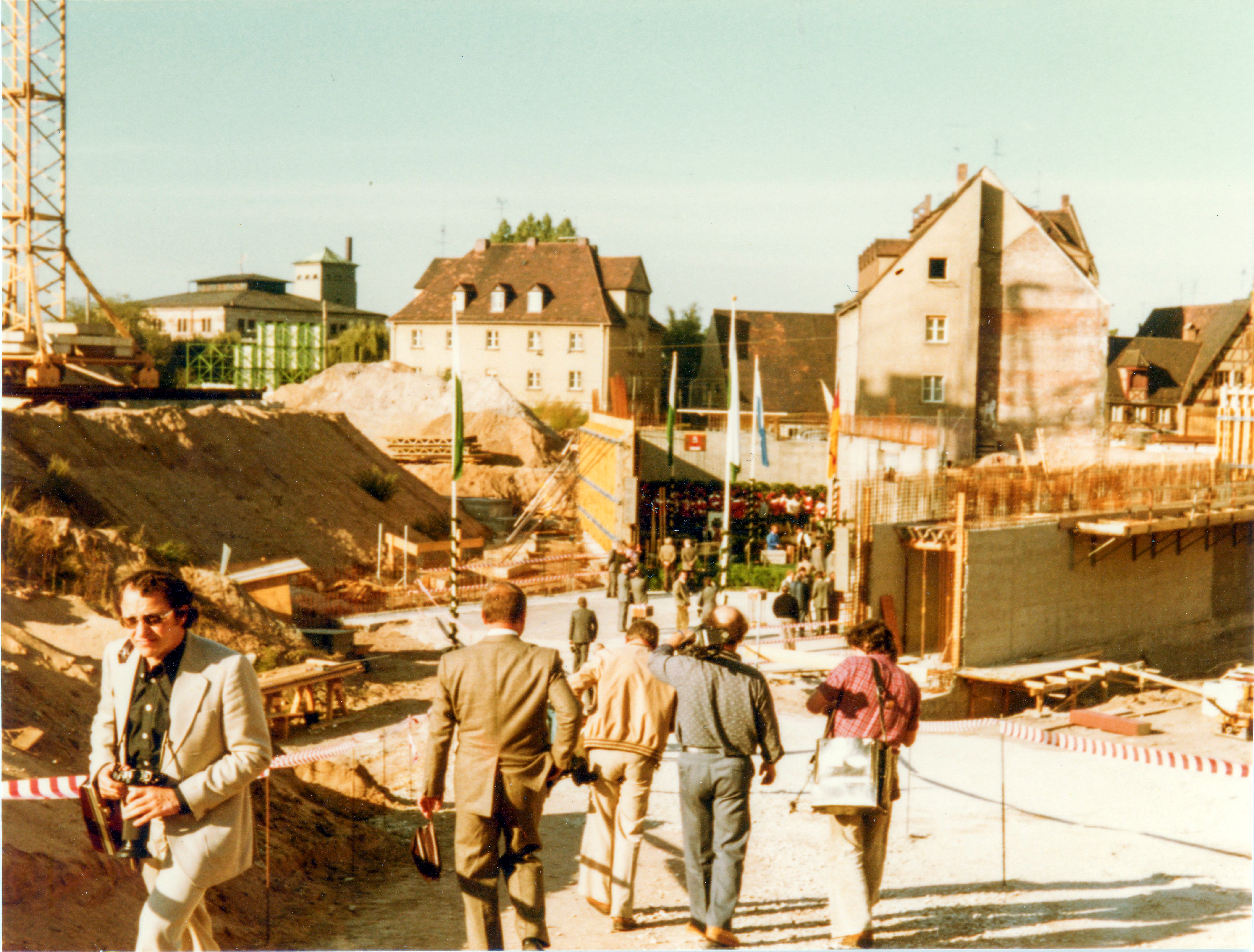 | Beschreibung | Grundsteinlegung der Stadthalle - im Hintergrund Königstraße 1 bzw. der ehem. Schlachthof, 3. Okt. 1980 | ||