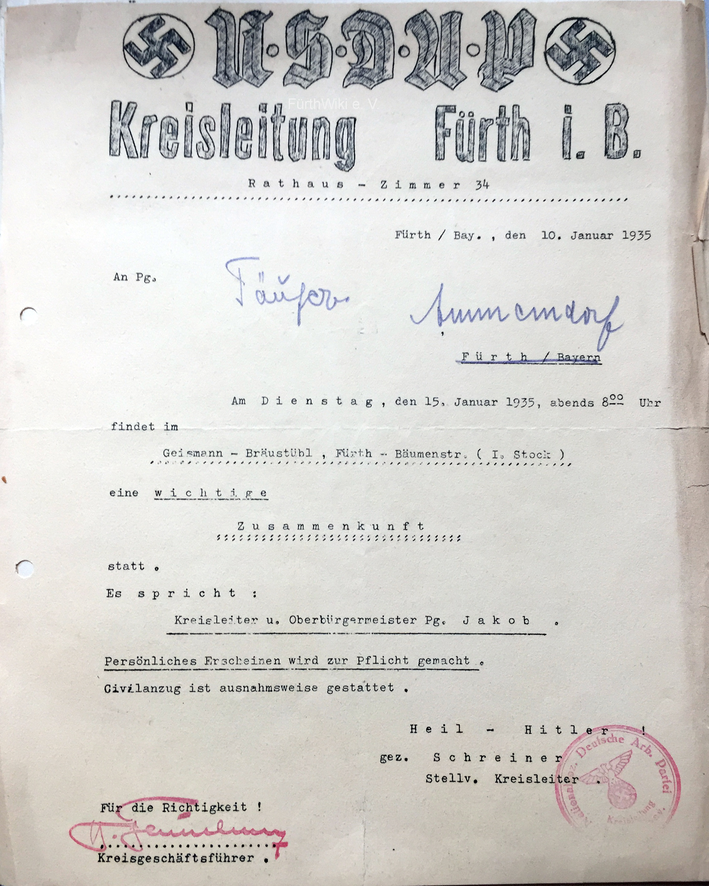 | Dateiinfo (Bild-Unterschrift und Info-Box, automatisch erstellt) | Einladung der NSDAP-Kreisleitung zur "wichtigen Zusammenkunft" im Geismann-Braustübl, 1935 Urheber: NSDAP Fürth<br>Erstellungsdatum: 10. Januar 1935<br>Lizenz: cc-by-sa-3.0 | ||
