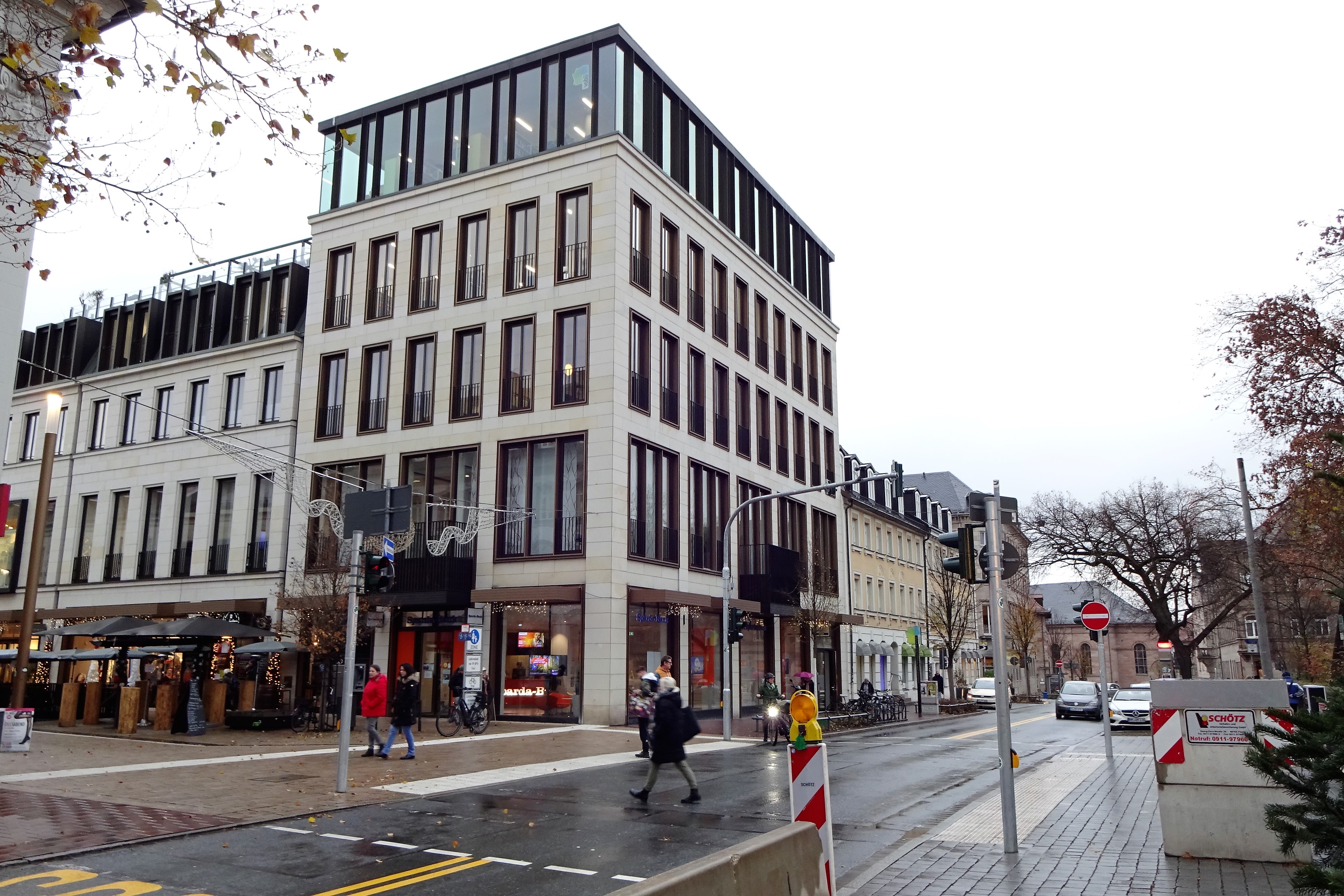 BeschreibungBlick von der Friedrichstraße mit Neuer Mitte und Volksbücherei an der Ecke Rudolf-Breitscheid-Straße, Dez. 2022