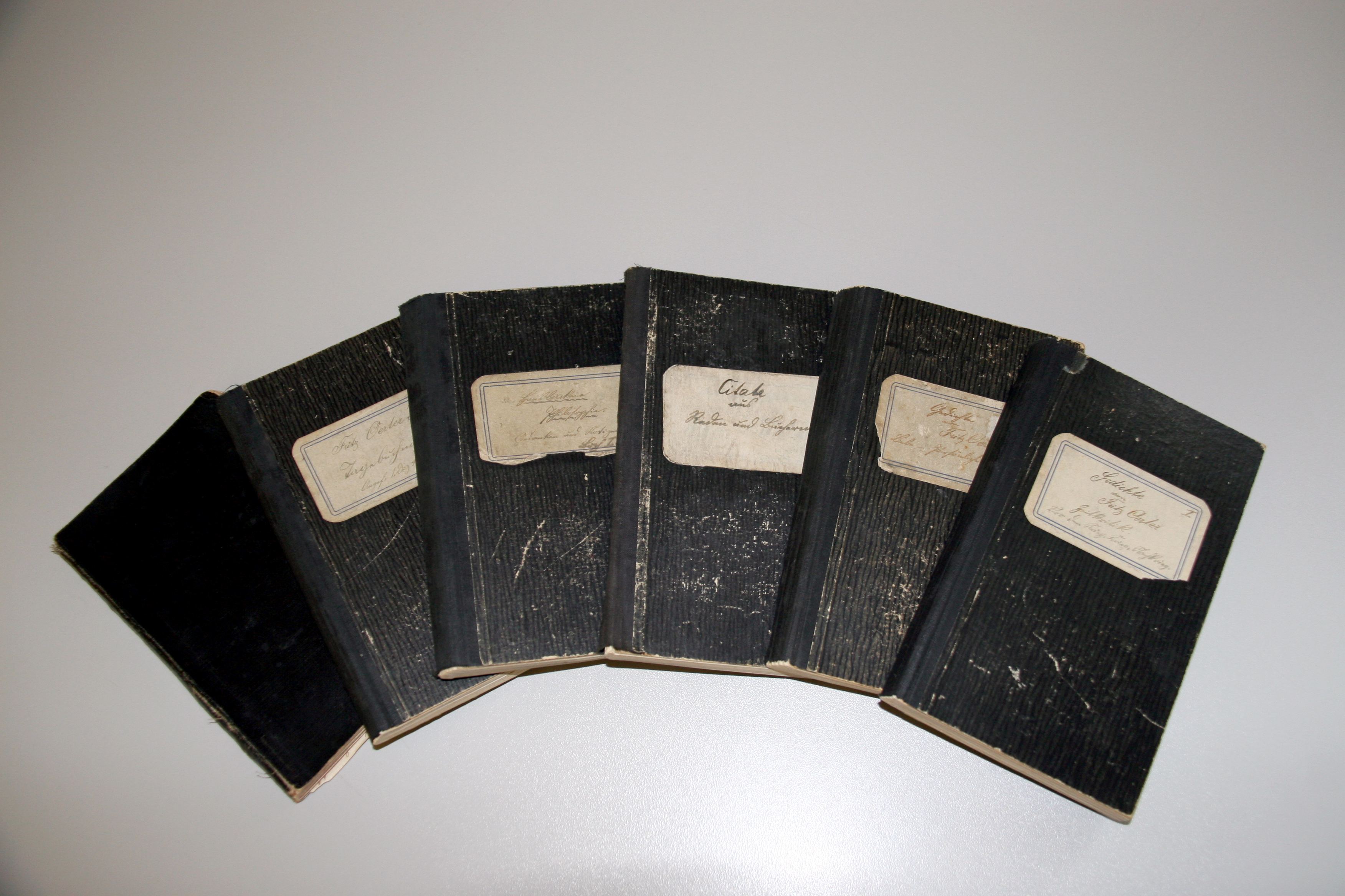| Dateiinfo (Bild-Unterschrift und Info-Box, automatisch erstellt) | Tagebücher und Gedichtbände von Fritz Oerter Urheber: Kamran Salimi<br>Erstellungsdatum: 1914<br>Lizenz: cc-by-sa-3.0 | ||