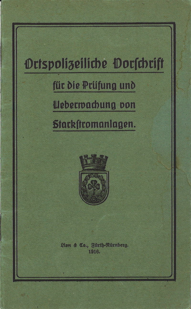 | Dateiinfo (Bild-Unterschrift und Info-Box, automatisch erstellt) | Ortspolizeiliche Vorschrift für die Prüfung und Ueberwachung von Starkstromanlagen Erstellungsdatum: 1916<br>Lizenz: cc-by-sa-3.0 | ||