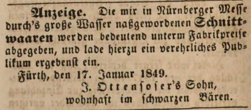 | Beschreibung | Zeitungsannonce von Ottensosers Sohn, Januar 1849 | ||