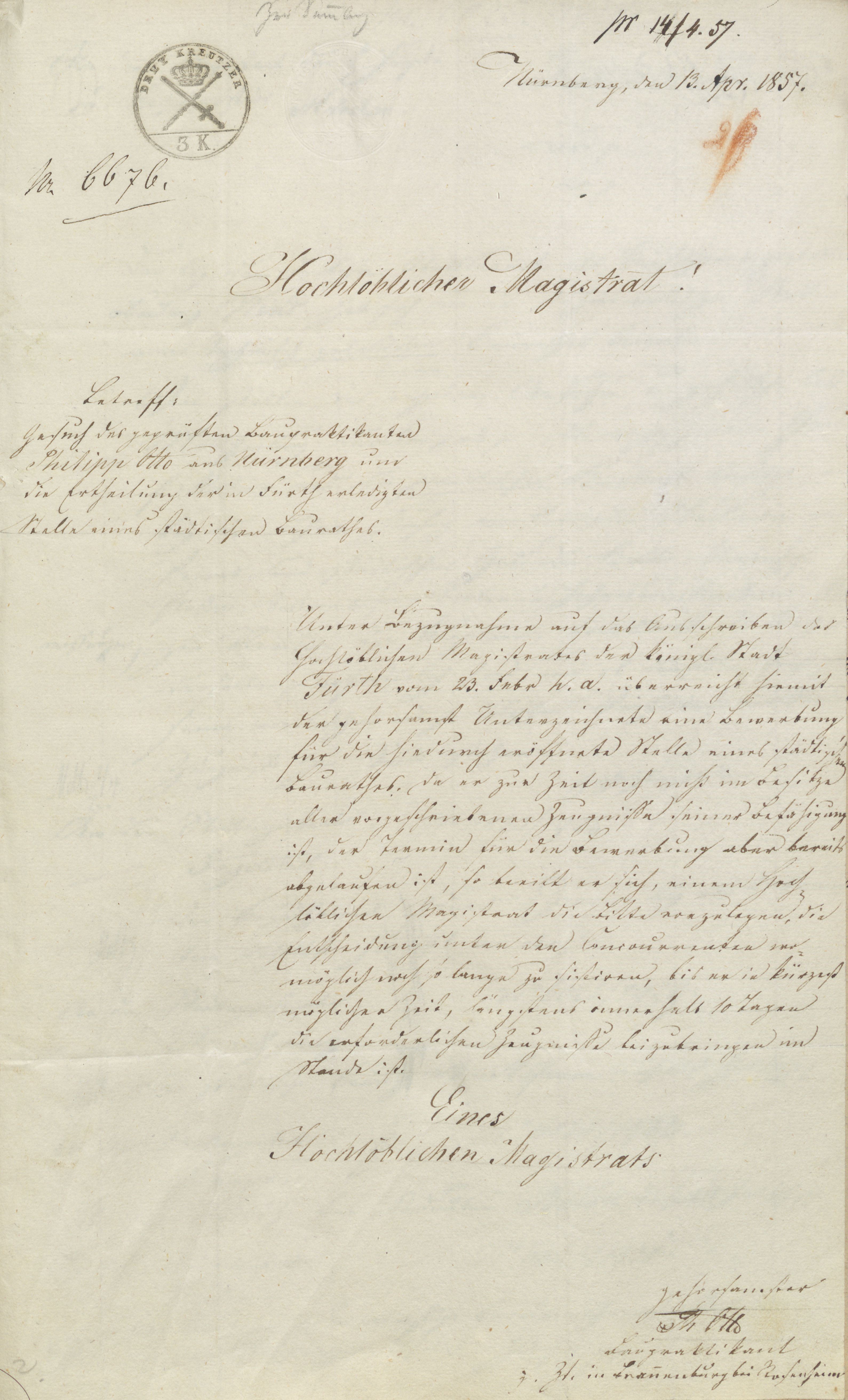 | Dateiinfo (Bild-Unterschrift und Info-Box, automatisch erstellt) | Verspätetes Bewerbungsschreiben des Baupraktikanten Philipp Otto vom 13. April 1857 Erstellungsdatum: 13. April 1857<br>Lizenz: Bildlizenz-Stadtarchiv | ||