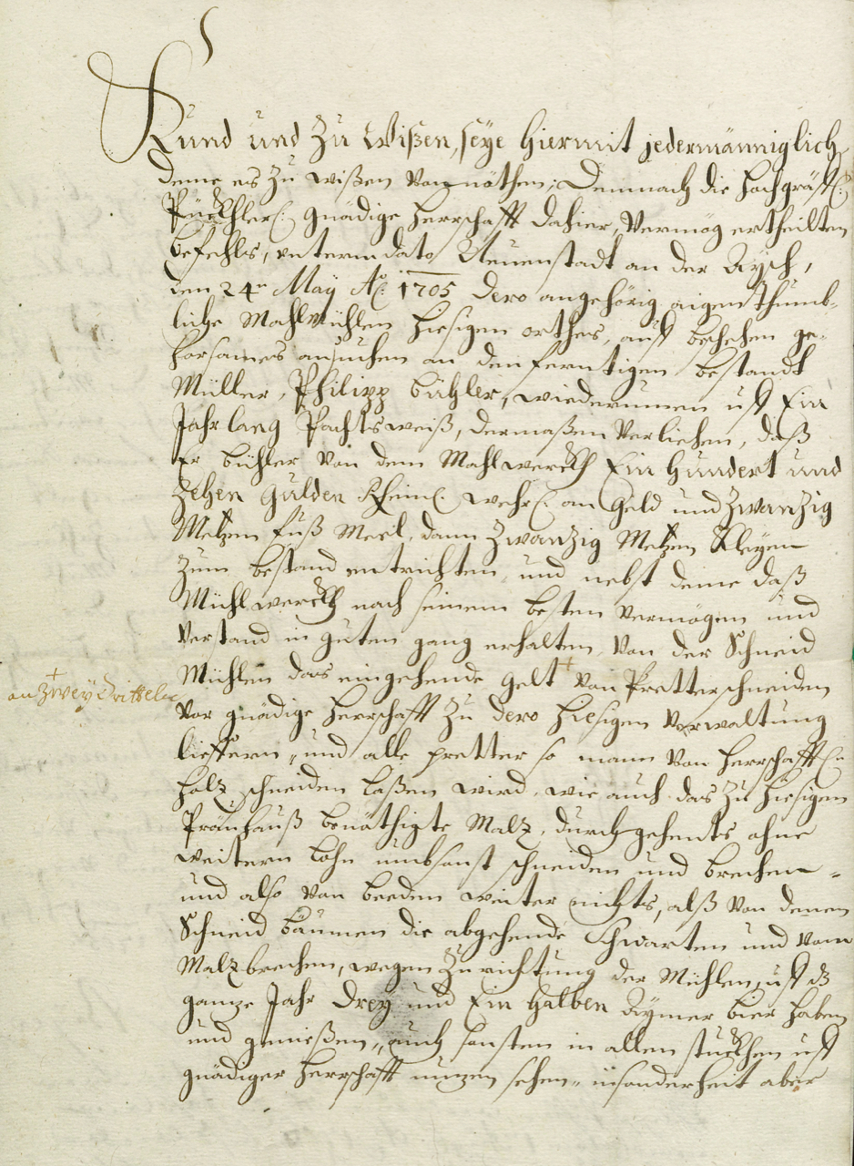 | Beschreibung | „Bestandt-Brief“ vom 16. Juli 1705 für Mühlpächter Philipp Bühler (S. 1) | ||