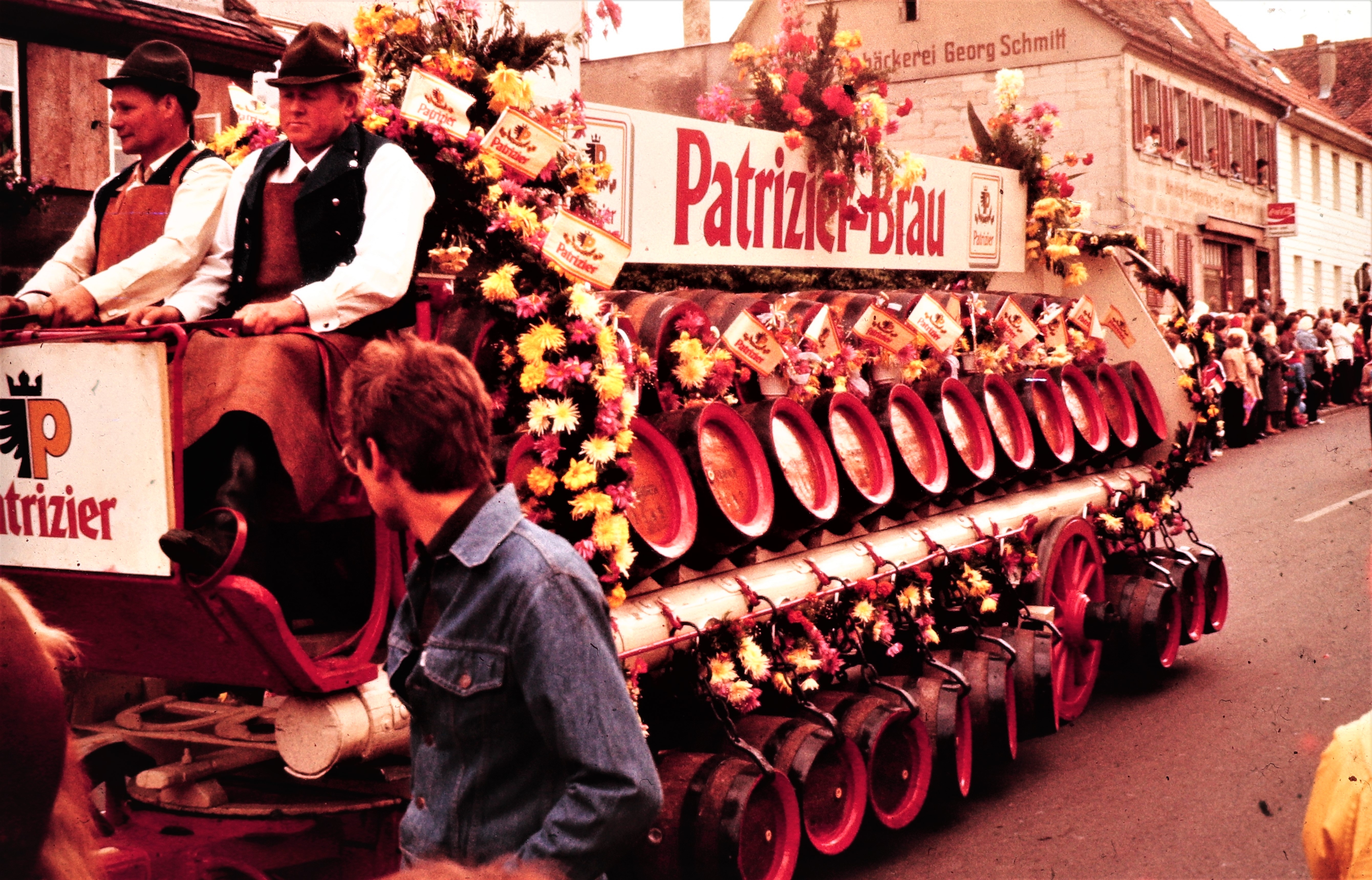 | Beschreibung | Festwagen und Brauereigespann der Patrizier Bräu im Festzug der 225. Erlanger Bergkirchweih 1980 | ||