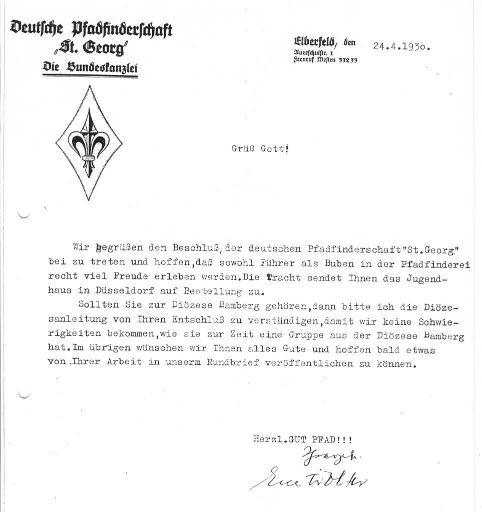 Pfadfinder St. Georg - Anerkennungs Schreiben vom 24.04.1930 als "Stamm" der Bundeskanzlei