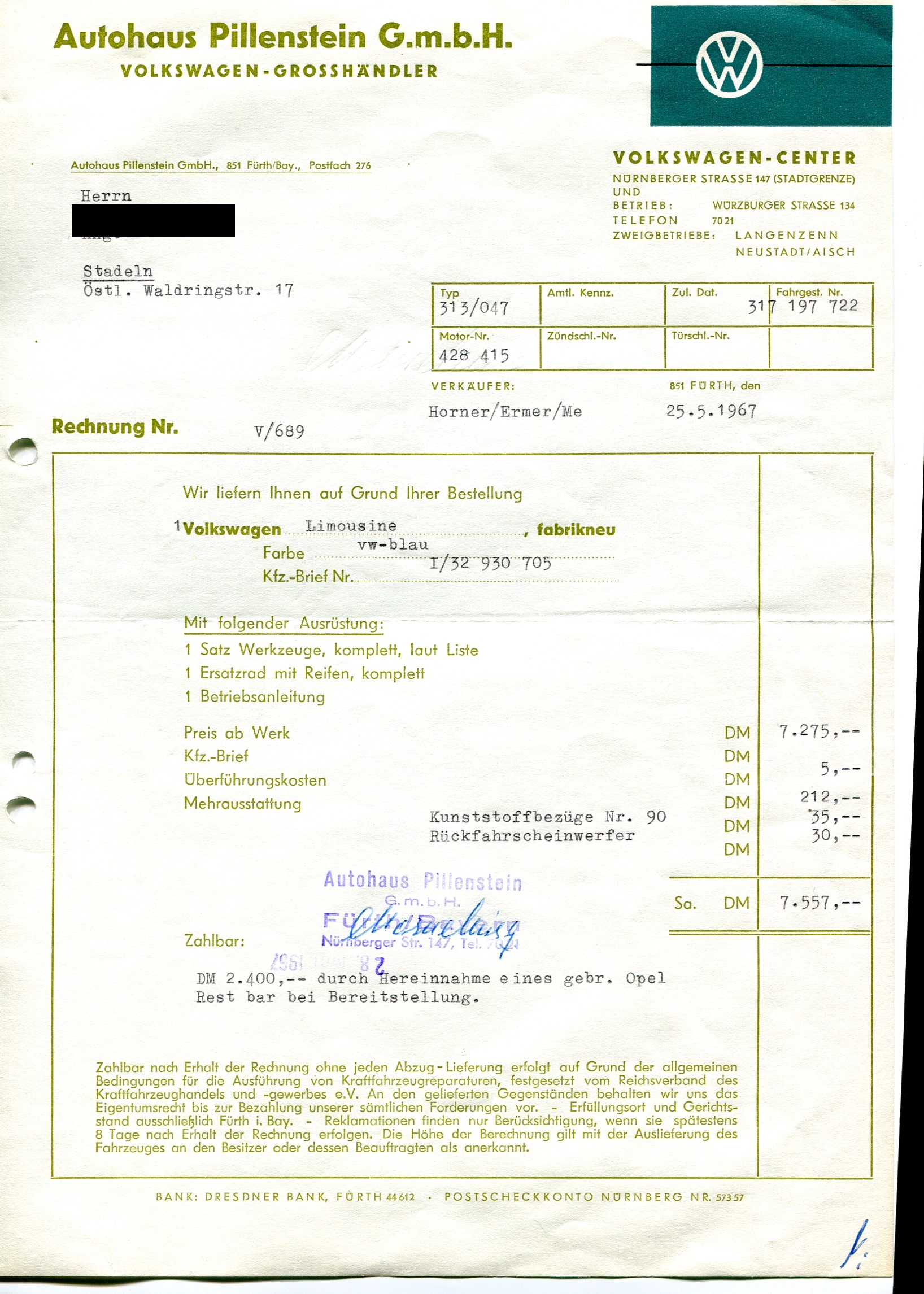 | Beschreibung | Auto Rechnung von 1967 der Firma Pillenstein über einen VW TL 1600 (im Volksmund „Traurige Lösung“) | ||