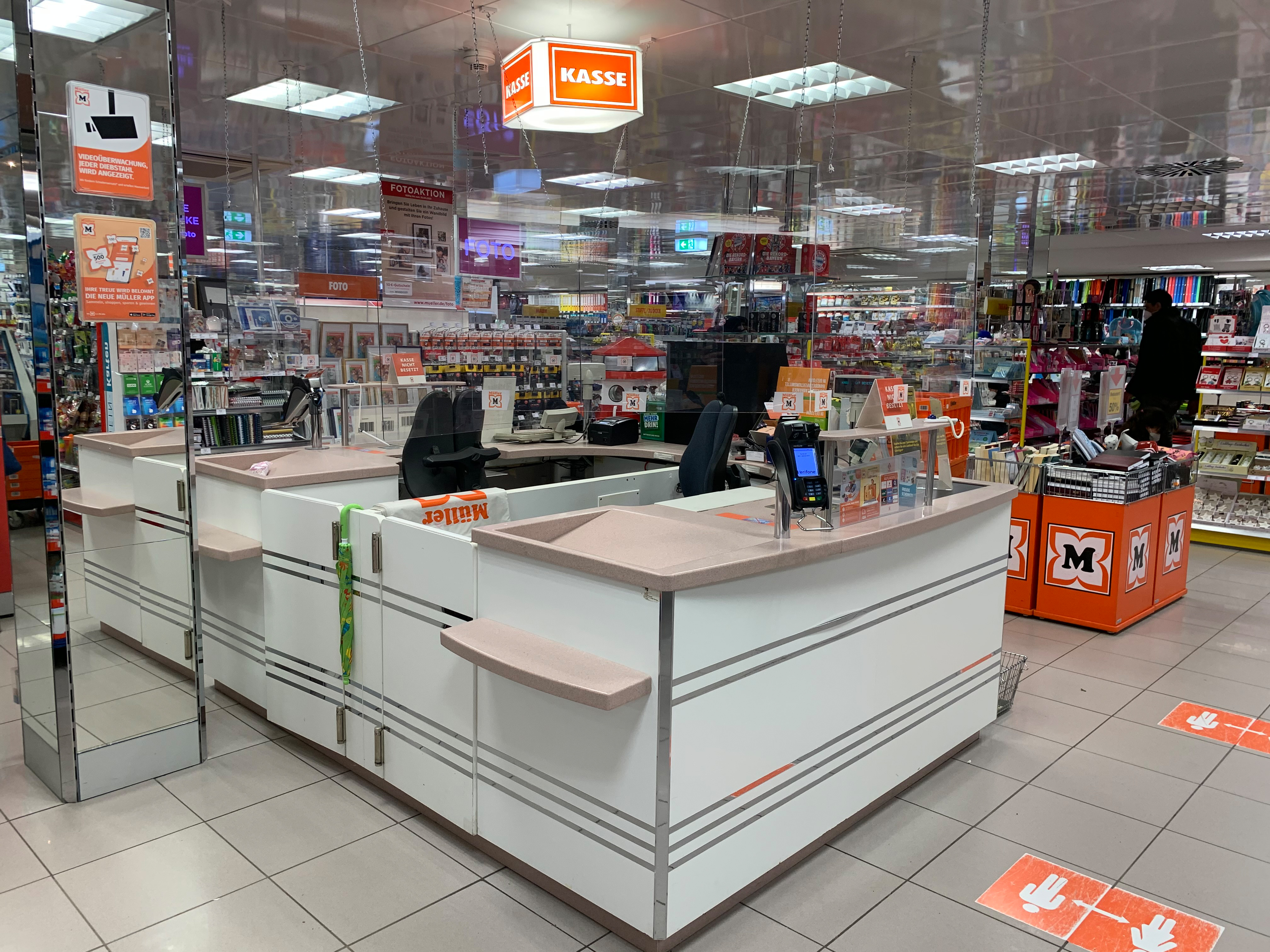 | Beschreibung | Plexiglasscheiben zum Schutz der Beschäftigten im Kassenbereich vor COVID 19 Viren, Mrz. 2021 | ||