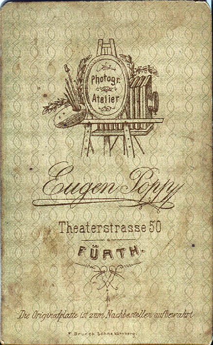 | Dateiinfo (Bild-Unterschrift und Info-Box, automatisch erstellt) | Rückseite einer Fotografie um 1880 Urheber: Eugen Popp<br>Erstellungsdatum: 1900<br>Lizenz: cc-by-sa-3.0 | ||