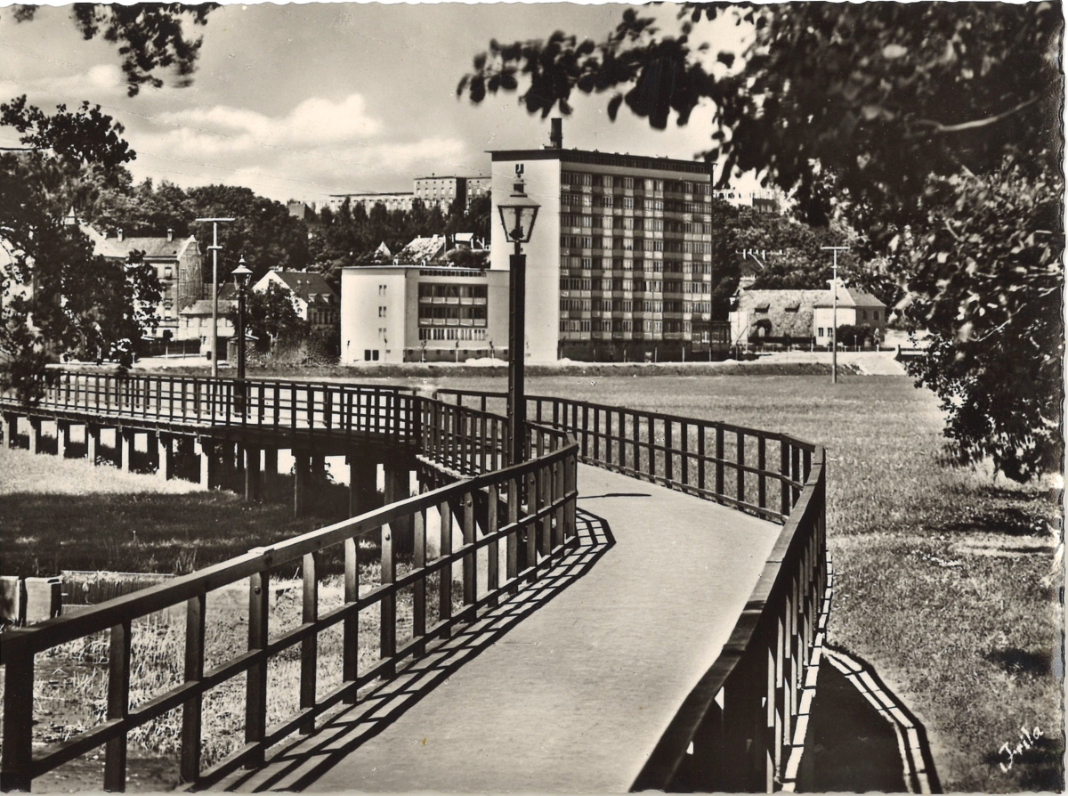 | Beschreibung | Blick vom Hardsteg zum Hochhaus Cadolzburger Str. 1/3 - Historische Postkarte, 1954 | ||