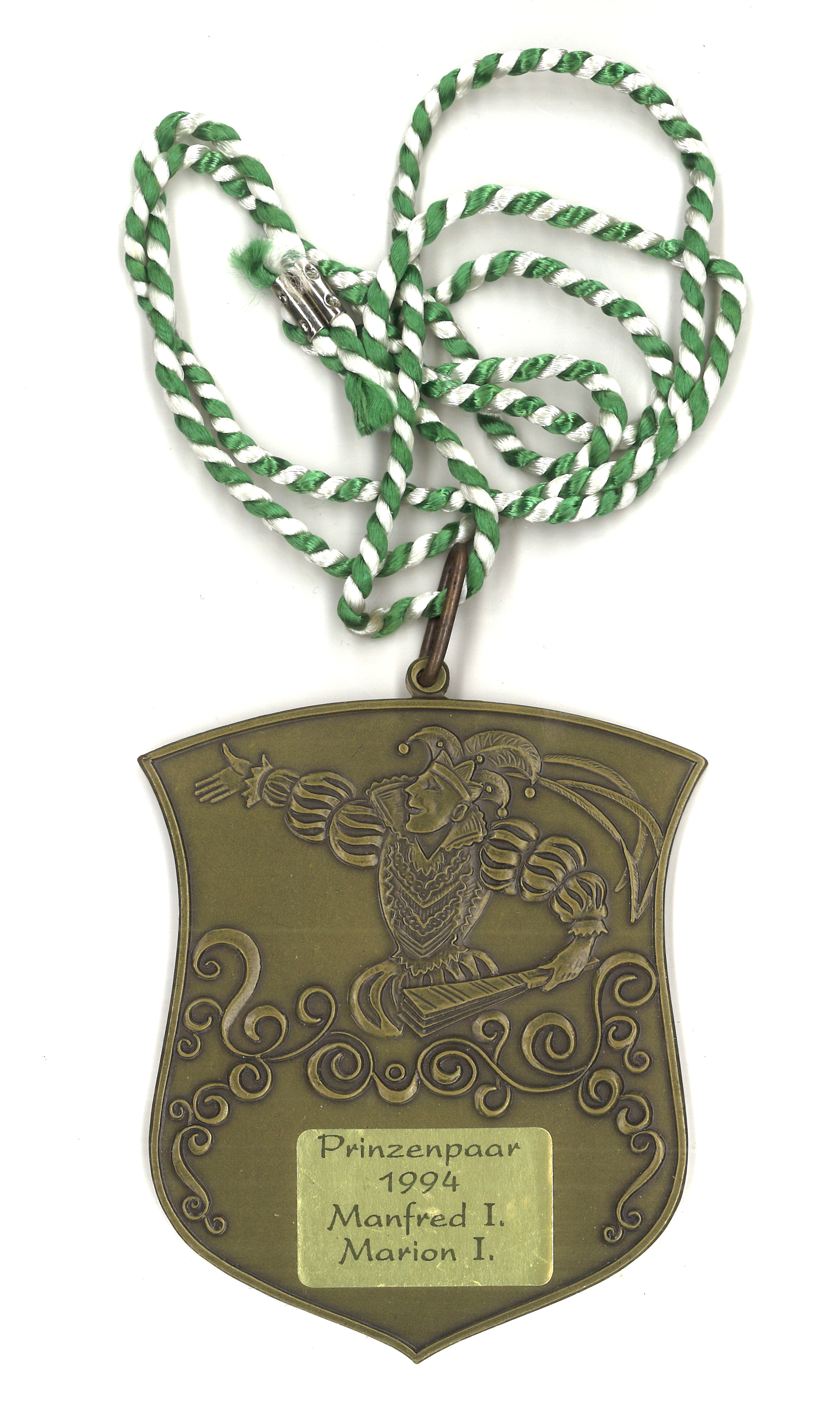 | Beschreibung | Prinzenpaarorden der CFK, Saison 1994, Metall, „Manfred I & Marion I“ | ||