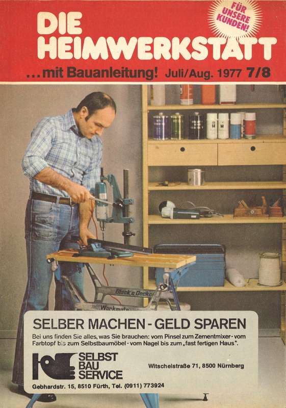 | Dateiinfo (Bild-Unterschrift und Info-Box, automatisch erstellt) | Die Heimwerkstatt - Titelseite Urheber: Verlagsgesellschaft Rudolf Müller GmbH & Co<br>Erstellungsdatum: 1977<br>Lizenz: Copyright | ||