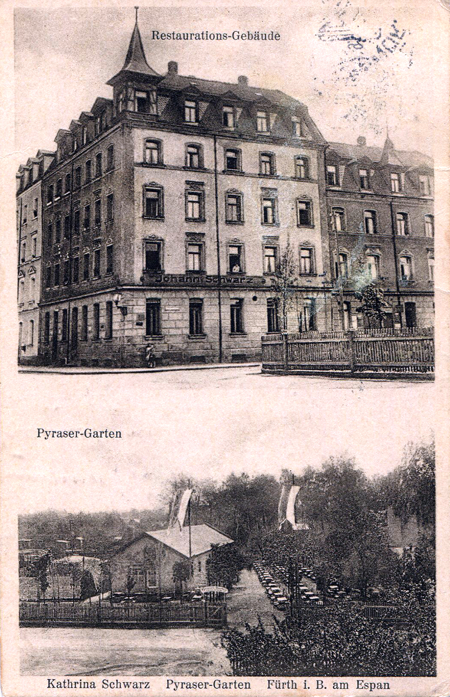| Beschreibung | Der ehem. Pyraser-Garten am Espan, Postkarte gel. 1938 | ||