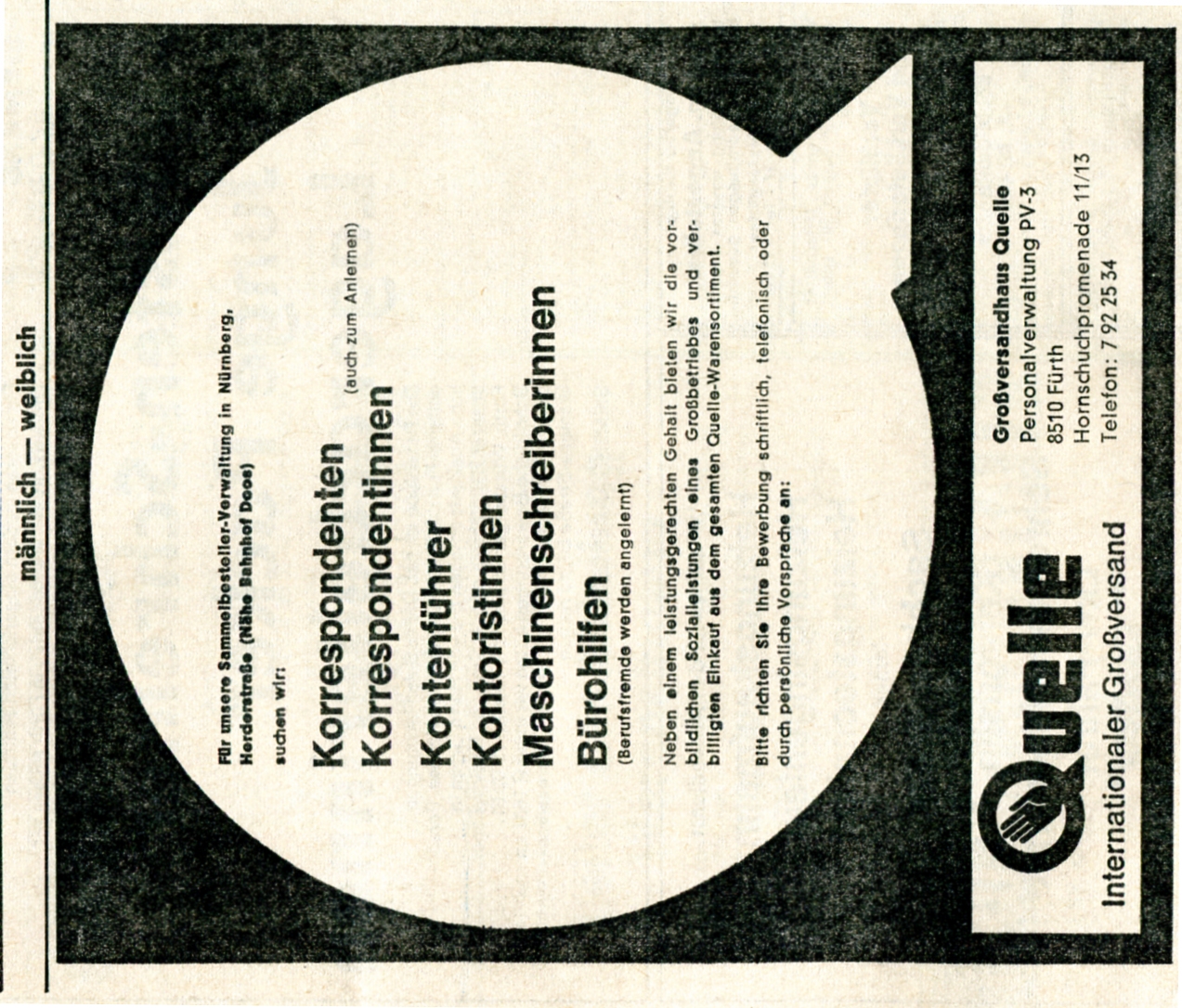 | Beschreibung | Inserat Personalsuche der Firma Quelle von 1970 | ||