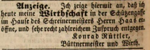 | Beschreibung | Wirtschaftseröffnung in der Schützengasse, September 1849 | ||