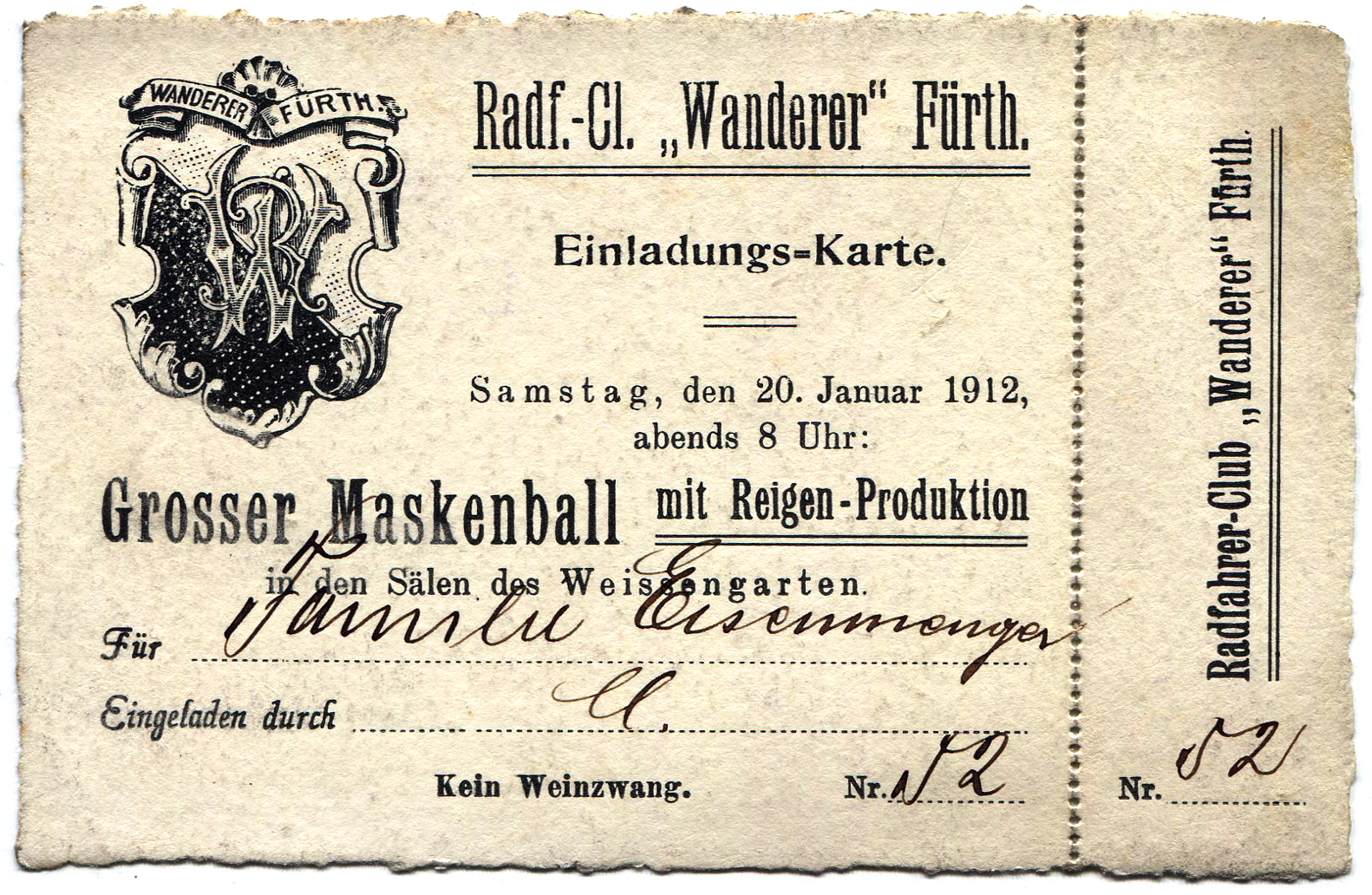 BeschreibungEinladungskarte zum Großen Maskenball im großen Sall der ehem. Gaststätte Weißengarten durch den Radfahrer-Club Wanderer, 1912