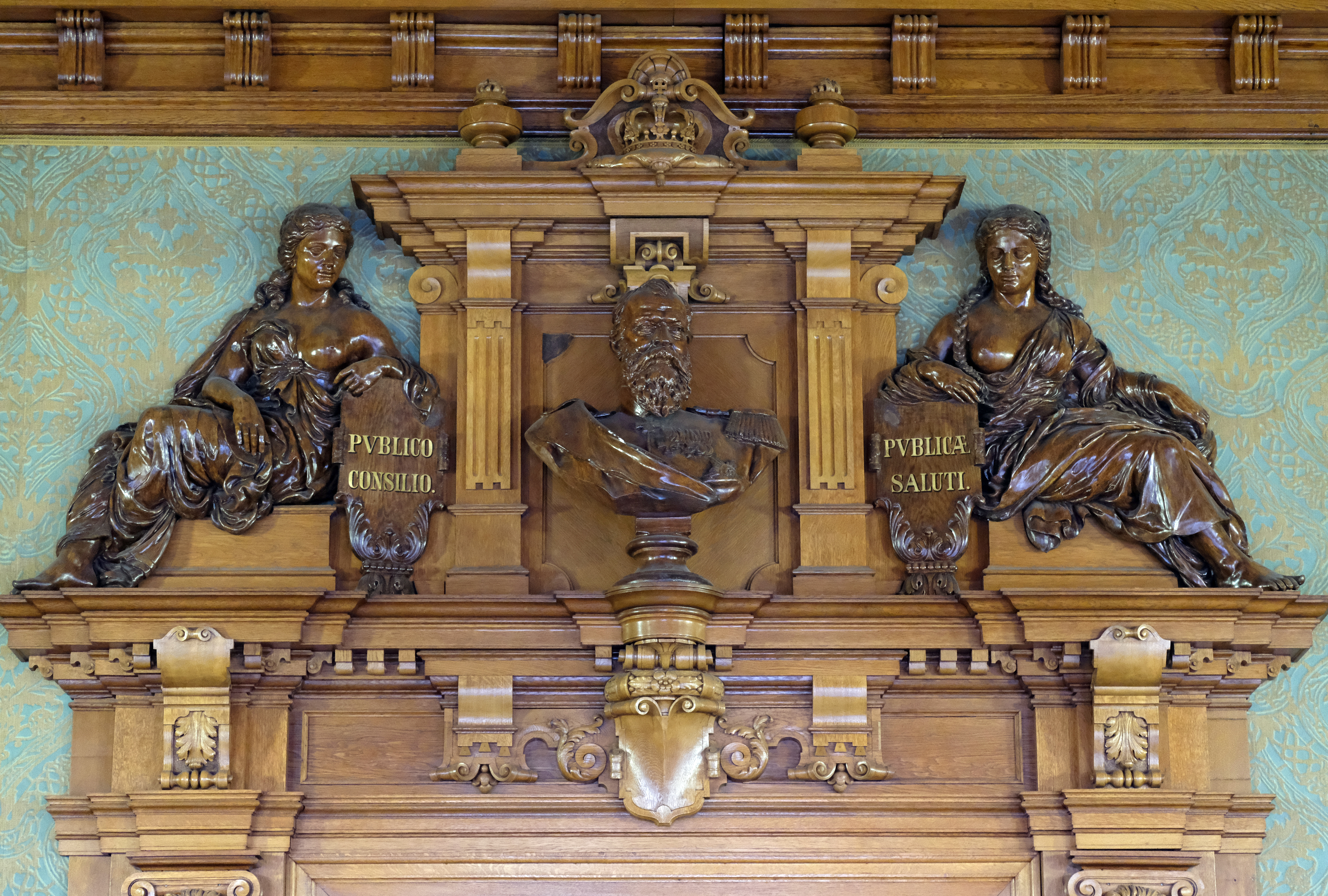 | Beschreibung | Holzschnitzarbeiten über dem Eingang zum Sitzungssaal im 2. OG im Rathaus, Nov. 2020 | ||