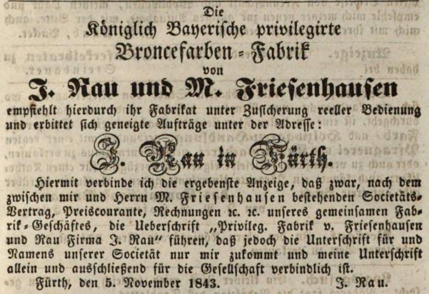 | Dateiinfo (Bild-Unterschrift und Info-Box, automatisch erstellt) | Zeitungsanzeige des Broncefarbenfabrikanten Isaak Rau, November 1843 Lizenz: noc-nc-1.0 | ||