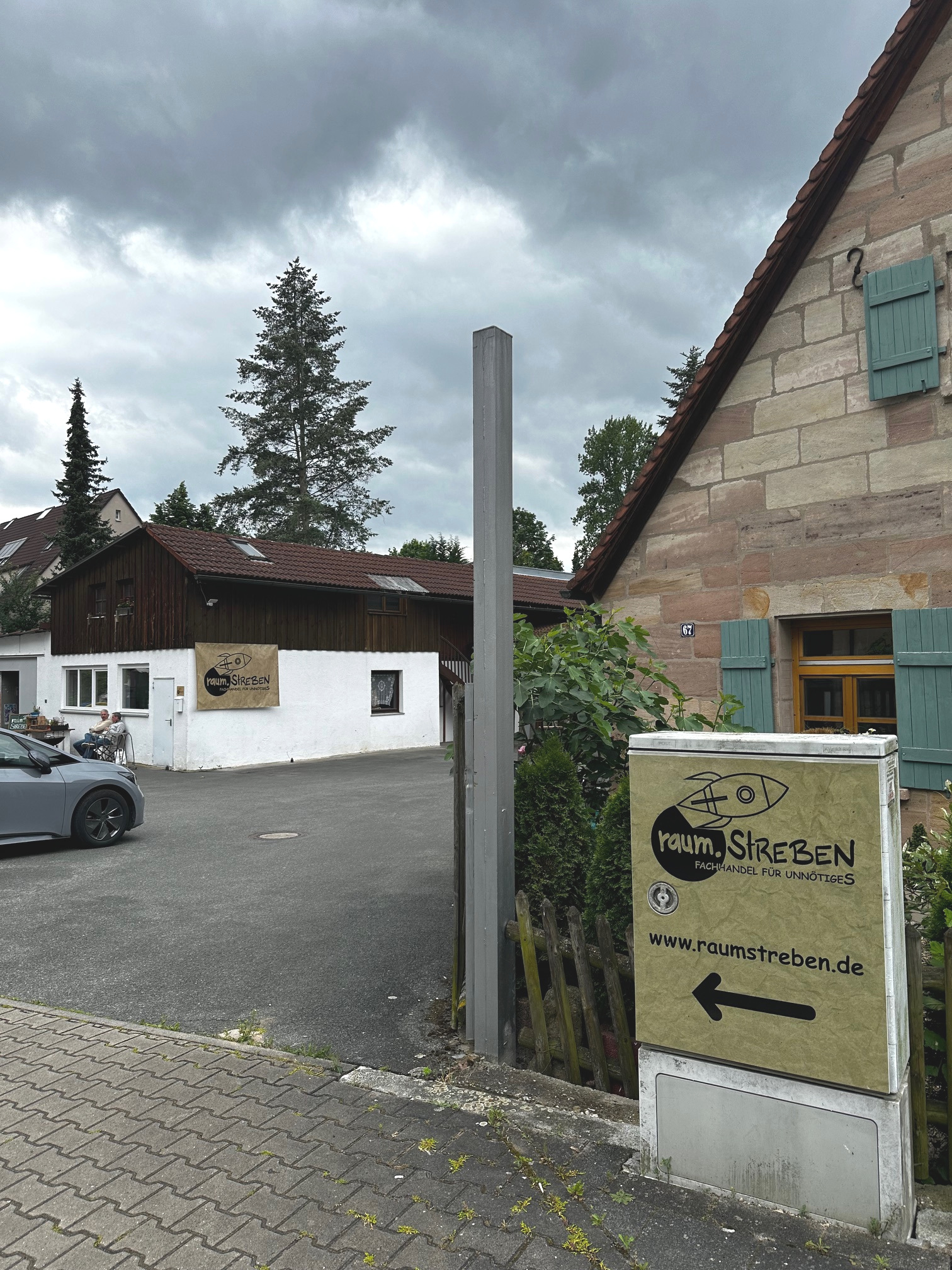 | Beschreibung | Werbung von raum.StREBEN vor Gebäude Fuchsstraße 67, Juni 2024 | ||