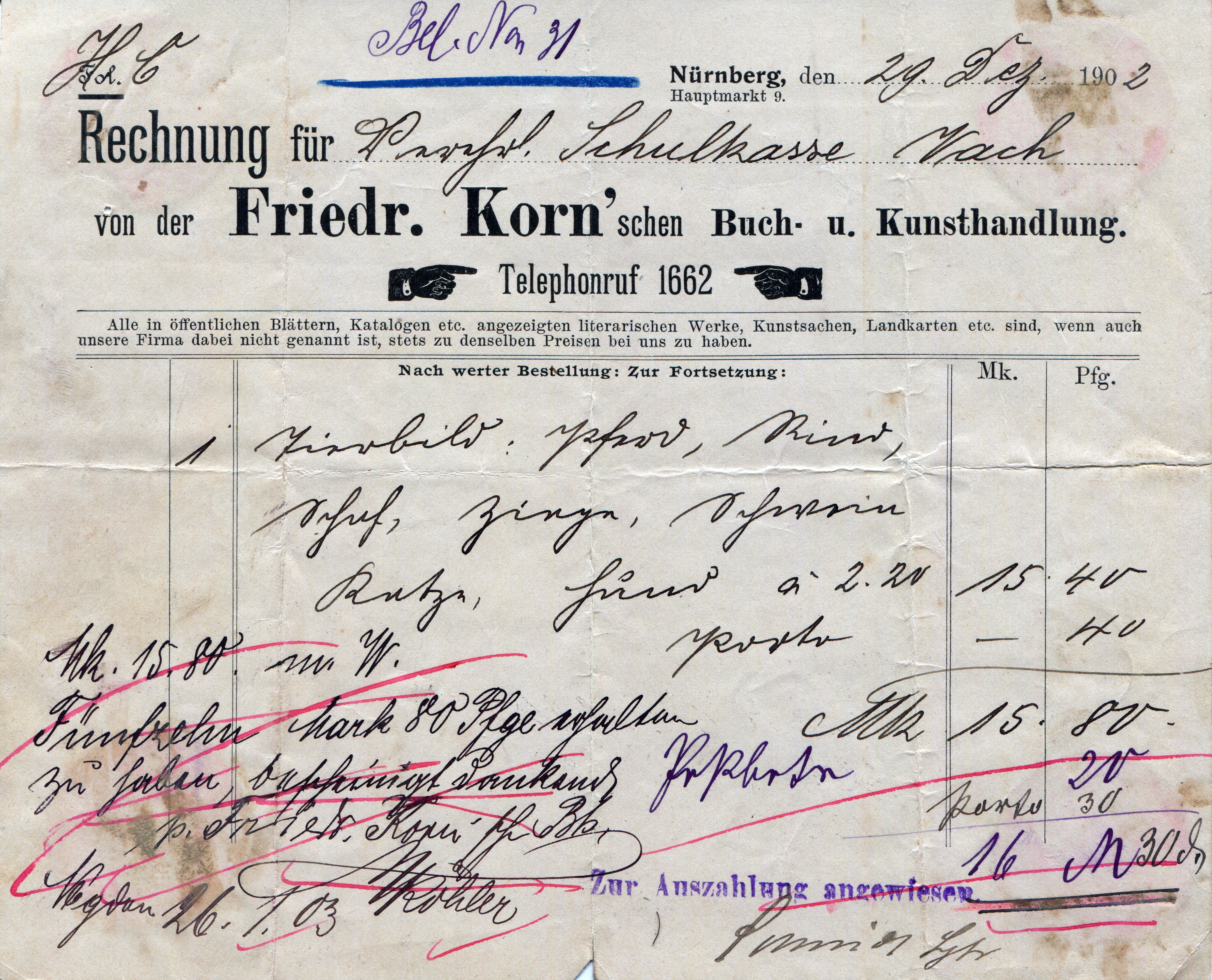 | Beschreibung | Rechnung der Friedrich Korn´sche Buchhandlung für die Vacher Schule aus dem Jahr 1902 | ||