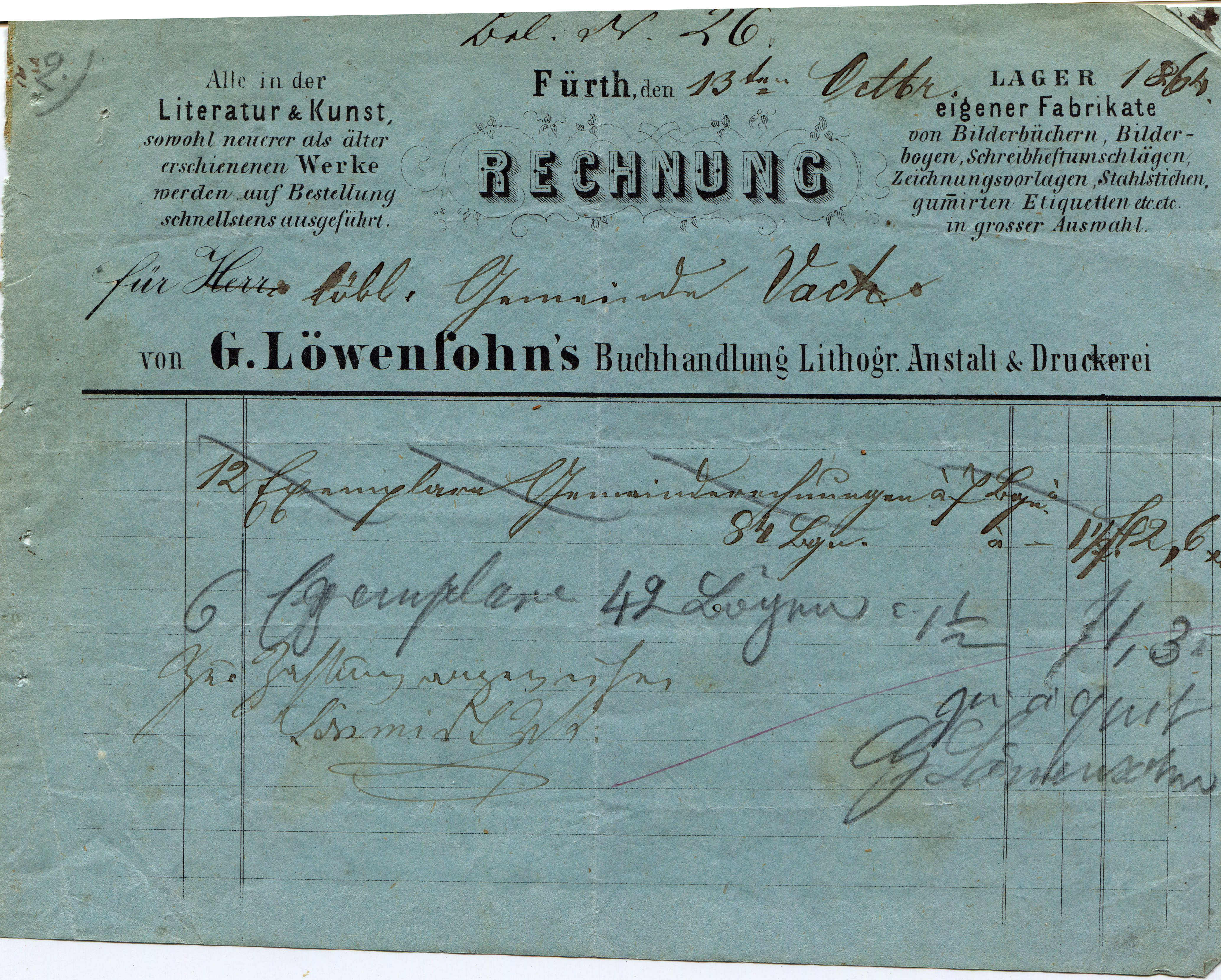 | Beschreibung | Rechnung von G. Löwensohn Buchhandlung Lithographische Anstalt & Druckerei vom 13. Oktober 1864 - mit Unterschrift von Gerson Löwensohn | ||