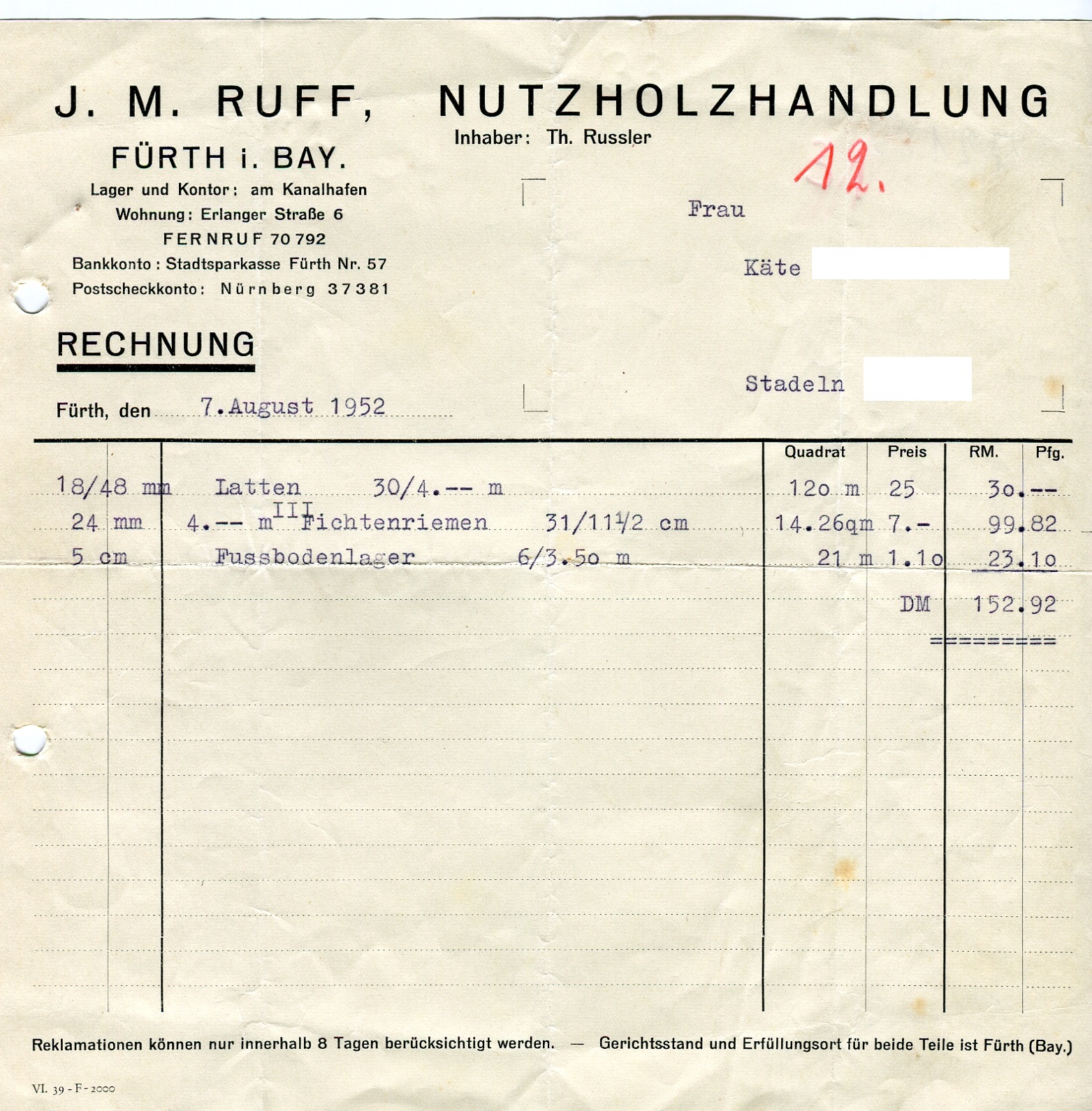 Rechnung der Firma J. M. Ruff Nutzholzhandlung 1952 am Fürther Kanalhafen des Ludwigskanal an der ehemaligen Poppenreuther Brücke. Besteht heute noch in Bislohe.