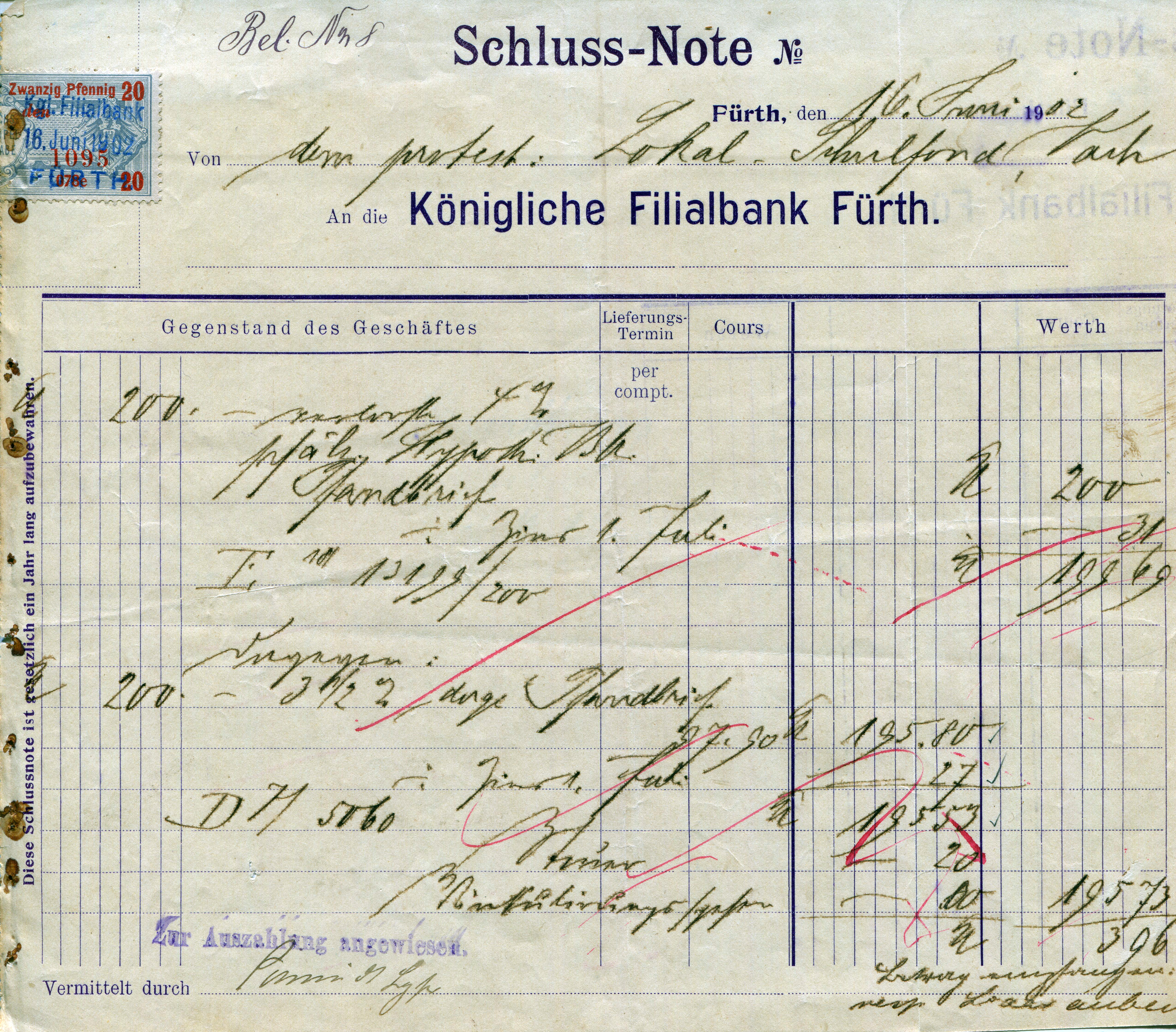 | Dateiinfo (Bild-Unterschrift und Info-Box, automatisch erstellt) | Rechnung der Königliche Filialbank Fürth, 1902 Urheber: Bayerische Staatsbank<br>Erstellungsdatum: 1902<br>Lizenz: cc-by-sa-3.0 | ||