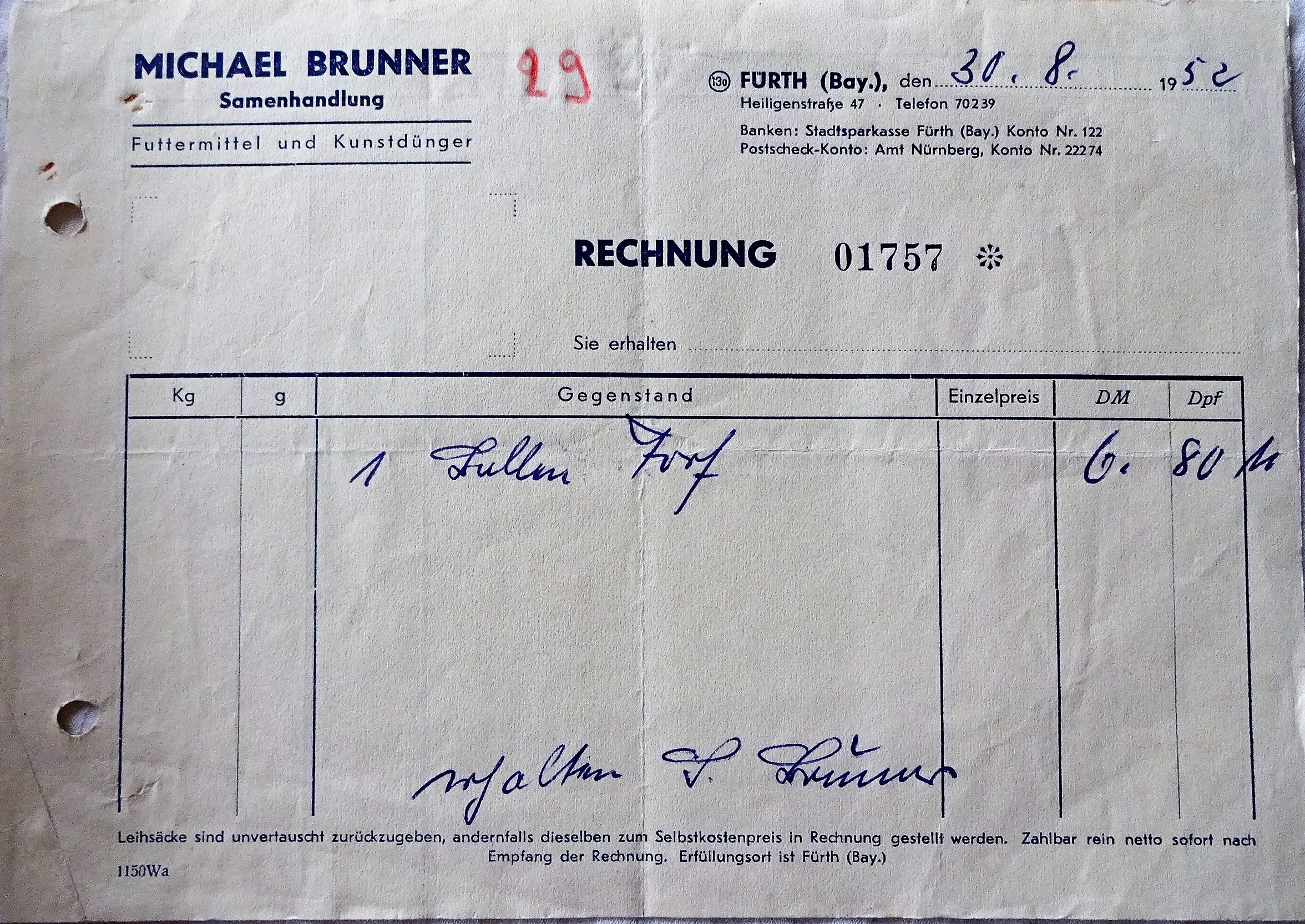 Rechnung der Firma Michael Brunner Futtermittel und Kunstdünger 1952 Heiligenstraße 47