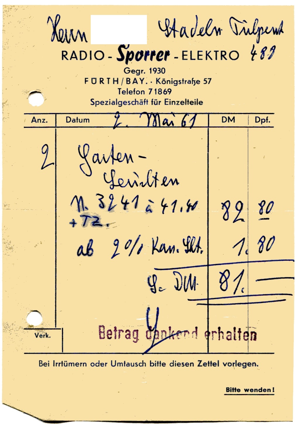 Rechnung der Firma Radio Sporrer Königstraße 57 von 1961