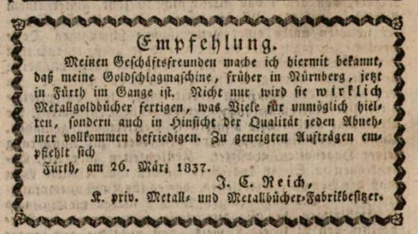 | Beschreibung | Werbeanzeige von Johann Christian Reich d. J., 1837 | ||
