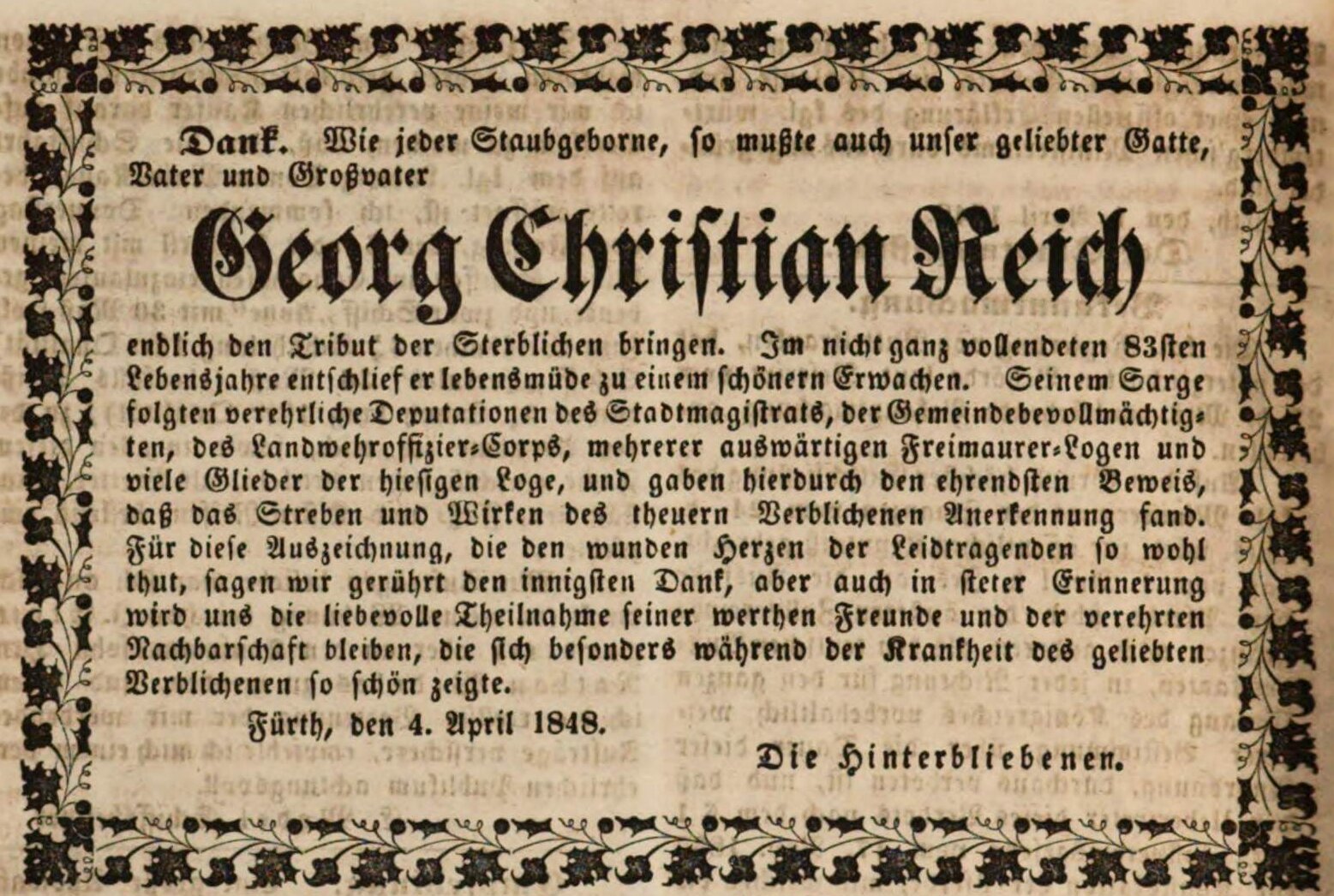 | Beschreibung | Traueranzeige für Georg Christian Reich, April 1848 | ||
