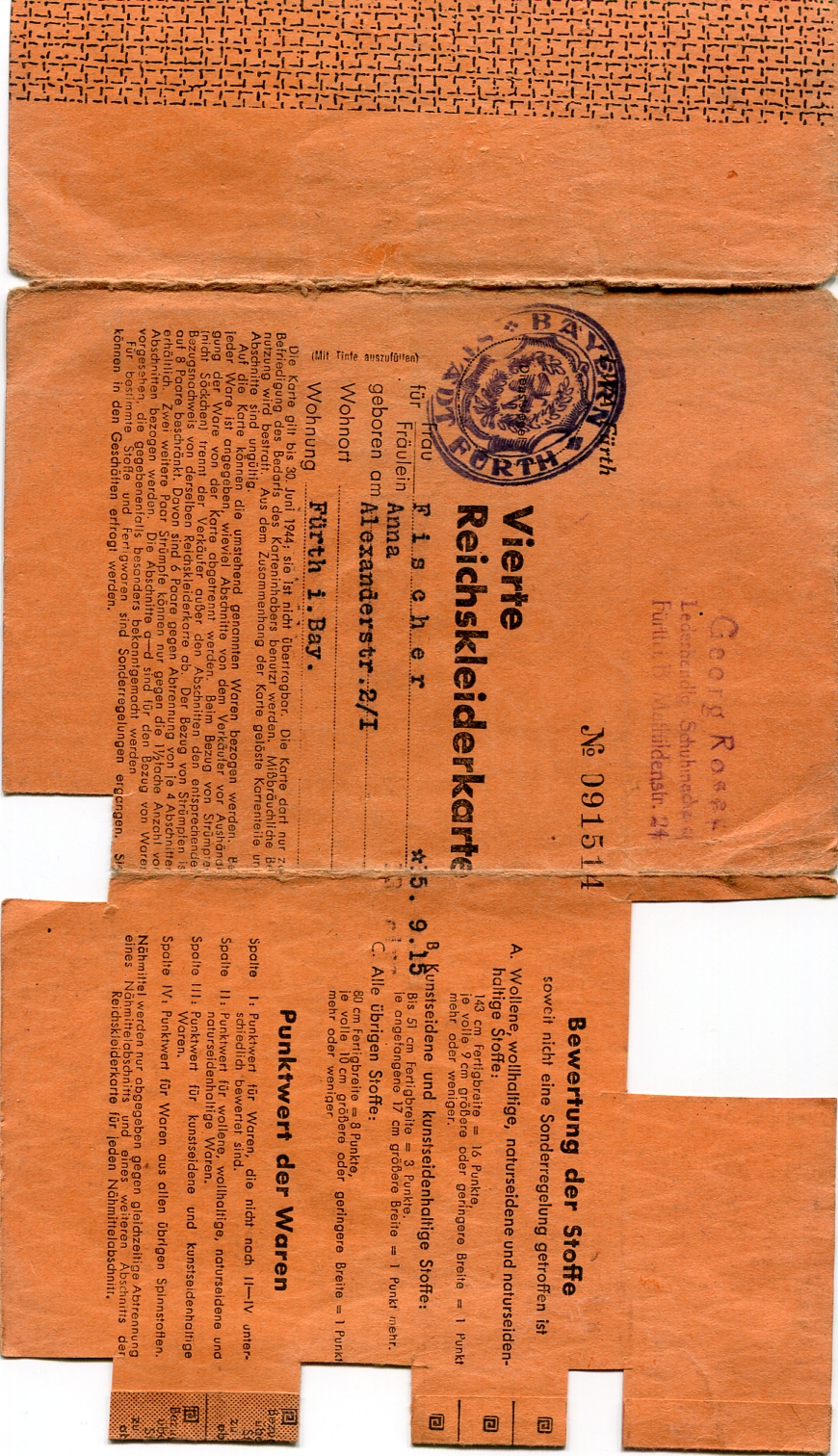 Vierte Reichskleiderkarte vom 1.10.1943 zum Erwerb rationierter Artikel wie auf der Karte vermerkt, die wegen der kriegsbedingten Mangelwirtschaft nicht mehr frei zu kaufen waren. Meine Eltern waren noch lange nach dem Krieg Kunde bei dem Schuhmacher in der Mathildenstraße 24 siehe Stempel auf Seite 1.