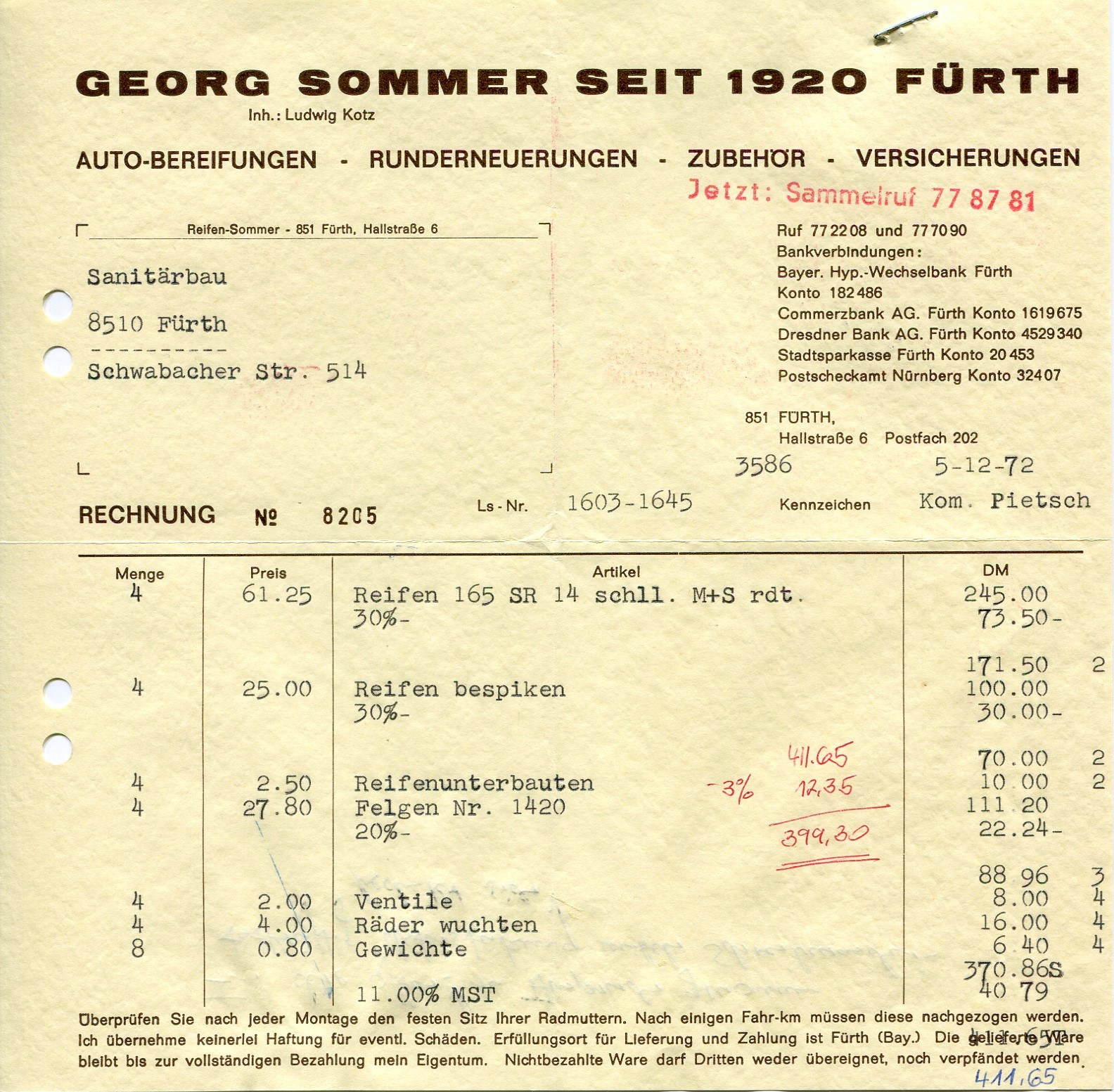 | Beschreibung | Rechnung vom Reifenhaus Sommer Dez. 1972 über 4 Spikes Winterreifen für VW K 70 | ||