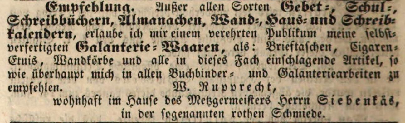 | Dateiinfo (Bild-Unterschrift und Info-Box, automatisch erstellt) | Zeitungsanzeige des Buchbinders W. Rupprecht, Dezember 1839 Erstellungsdatum: Dezember 1839<br>Lizenz: noc-nc-1.0 | ||