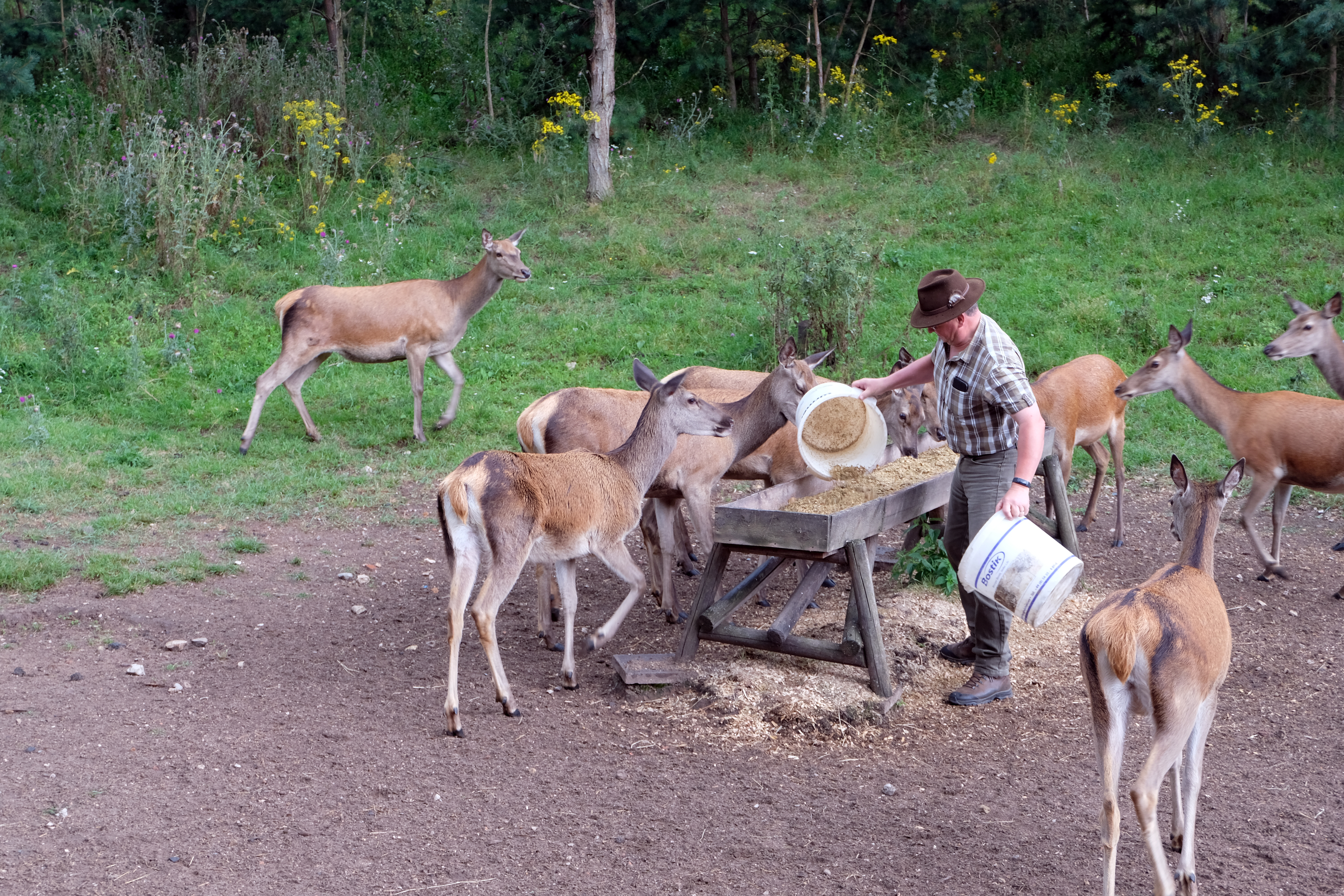 | Beschreibung | Rotwild bei der Fütterung durch den Stadtförster Martin Straußberger im Rotwildgehege im Stadtwald, Aug. 2021 | ||