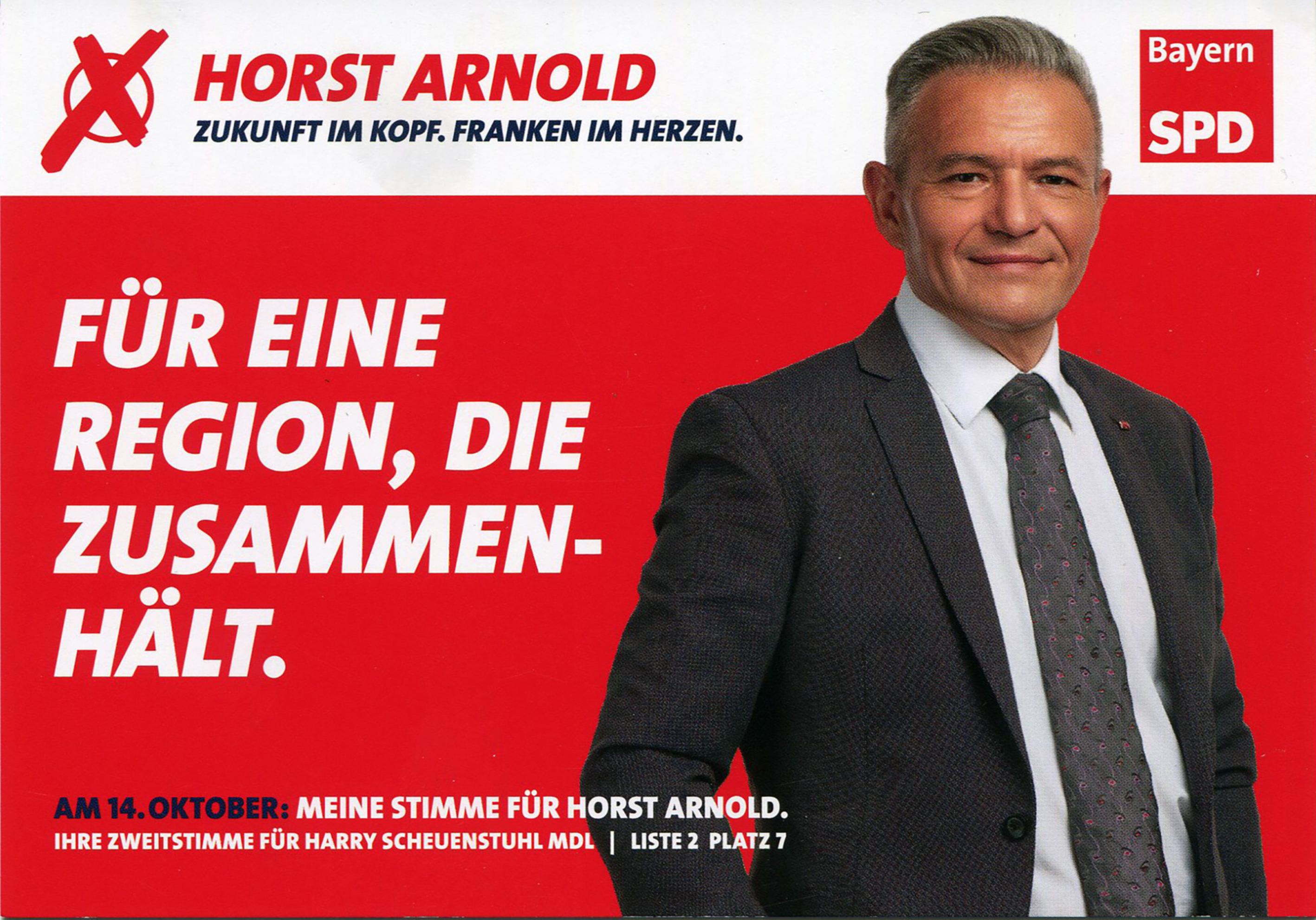 | Dateiinfo (Bild-Unterschrift und Info-Box, automatisch erstellt) | SPD-Wahlkampfpostkarte von Horst Arnold zur Landtagswahl 2018 Urheber: SPD Fürth<br>Erstellungsdatum: 2018<br>Lizenz: cc-by-sa-3.0 | ||
