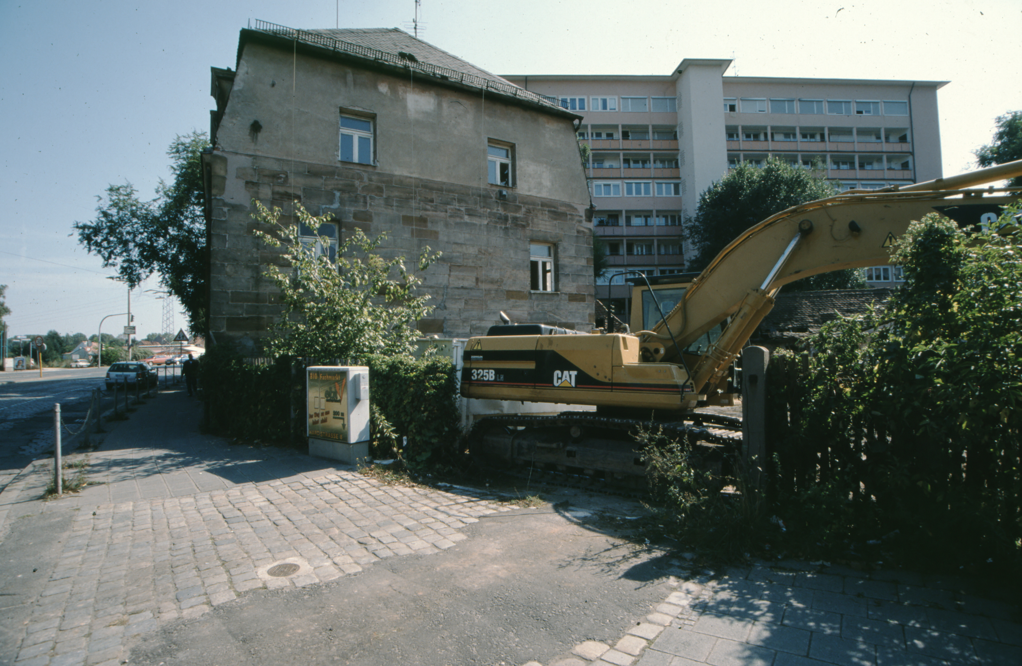 | Beschreibung | Blick von der Würzburger Straße stadteinwärts auf die Gastwirtschaft Zur Blauen Glocke. Beginn der Abrissarbeiten | ||