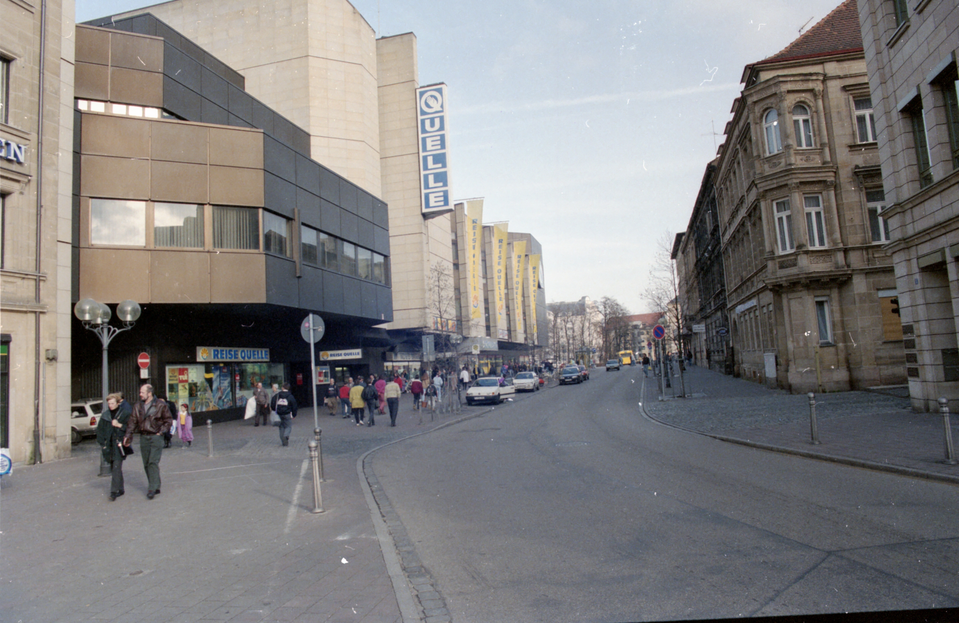 | Beschreibung | Blick vom Bahnhofplatz in die Gustav-Schickedanz-Str. mit Quelle-Kaufhaus | ||