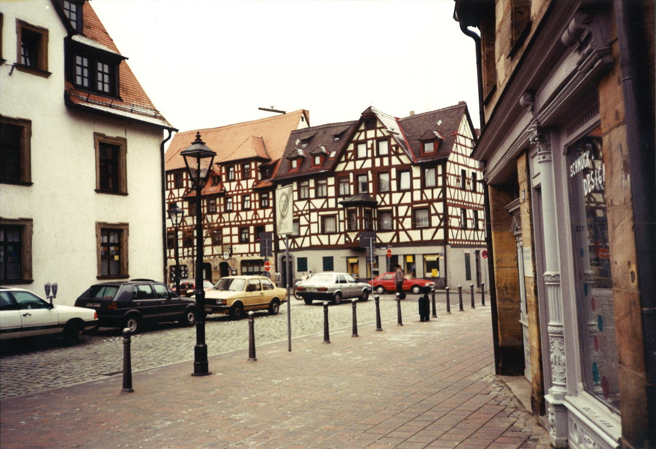 | Beschreibung | Blick aus der Gustavstr. auf Marktplatz 7 und 11, links das bambergische Amtshaus, ca. 1990 | ||