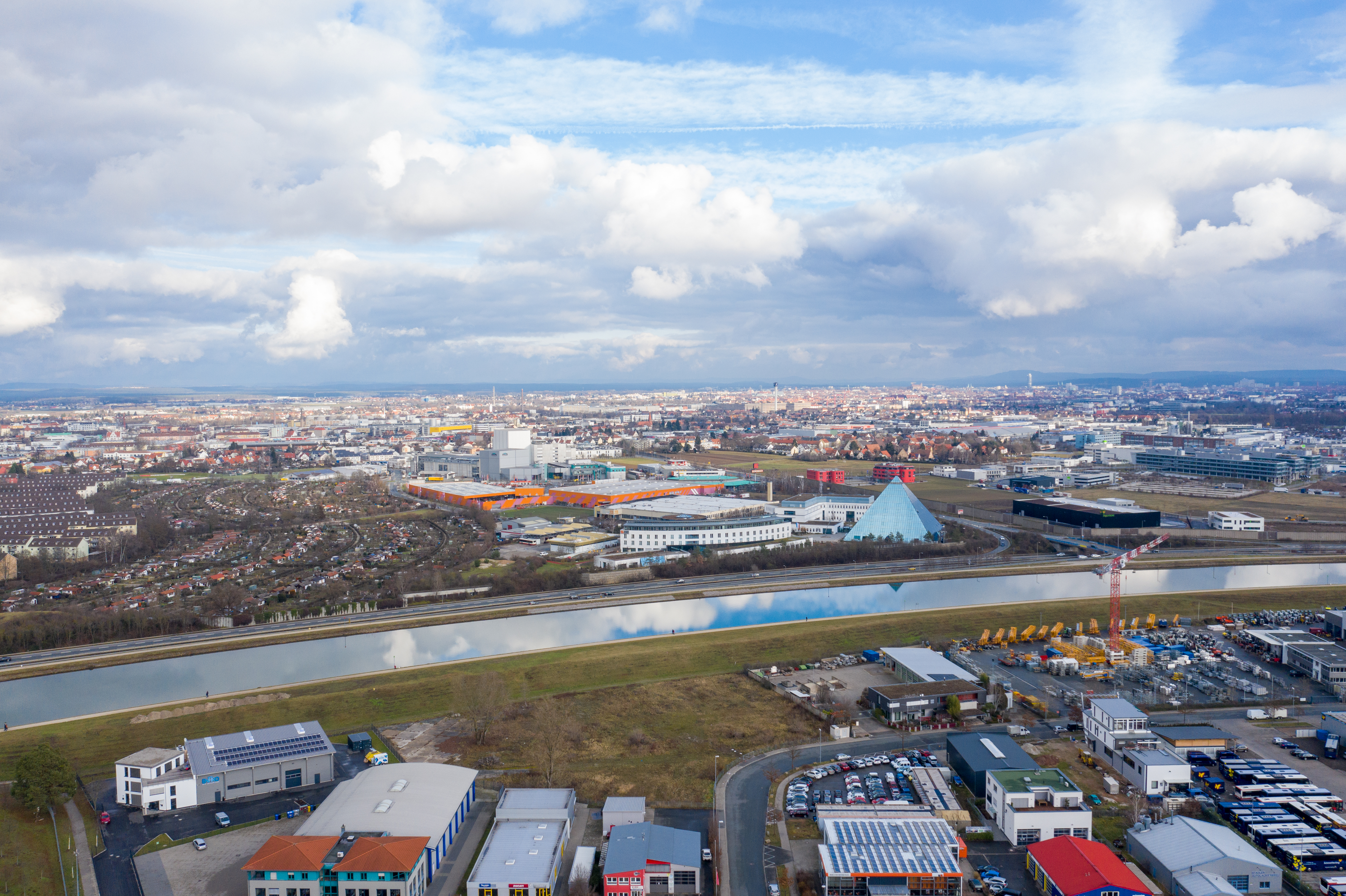 | Beschreibung | Blick über die Südstadt mit Main-Donau-Kanal und Schön Klinik Nürnberg Fürth; Dez. 2019 | ||