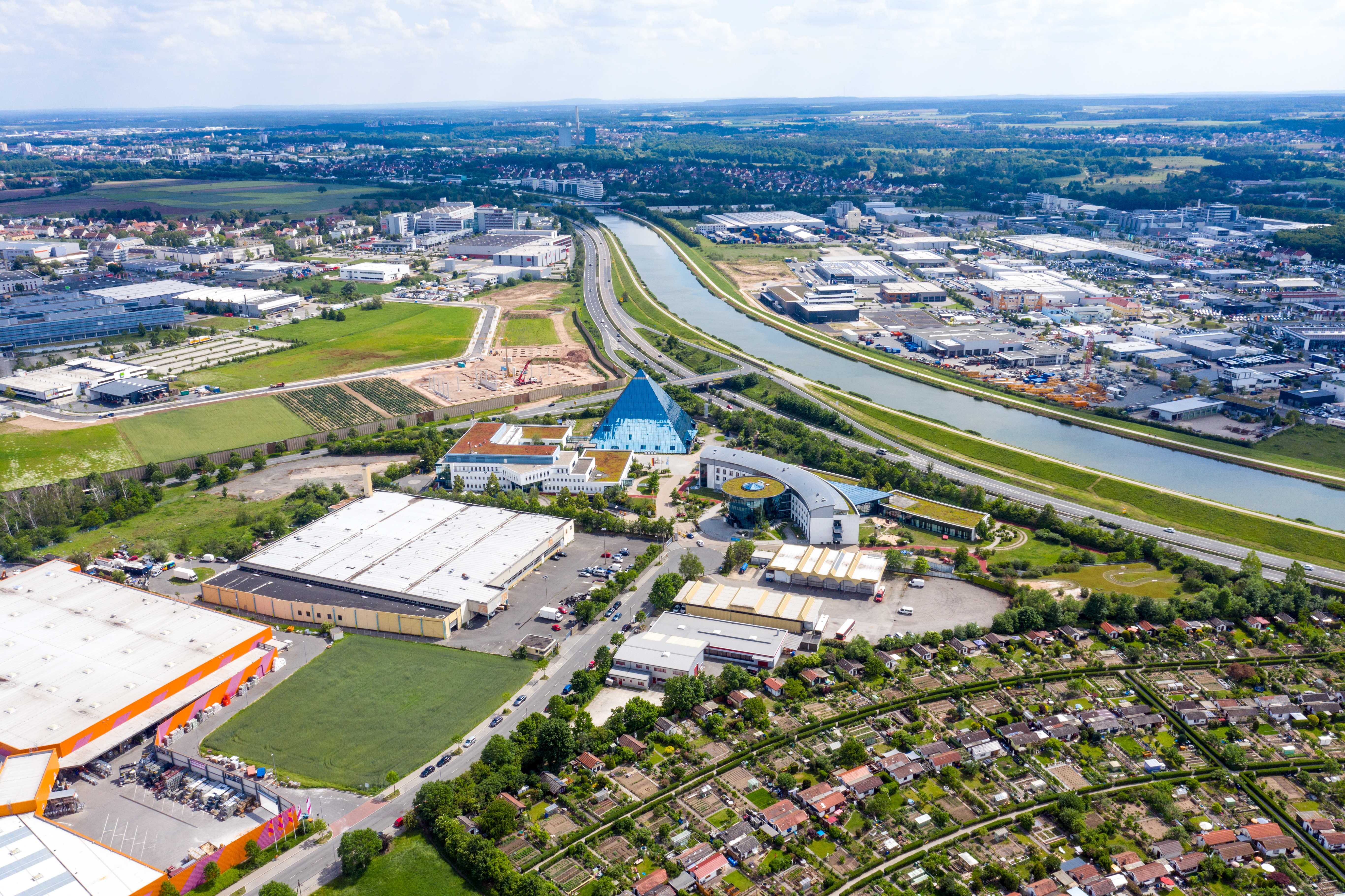 | Beschreibung | Blick über die Südstadt mit der Kleingartenkolonie Süd II, Schön Klinik und der Hotel-Pyramide, sowie dem Main-Donau-Kanal, Mai 2019 | ||
