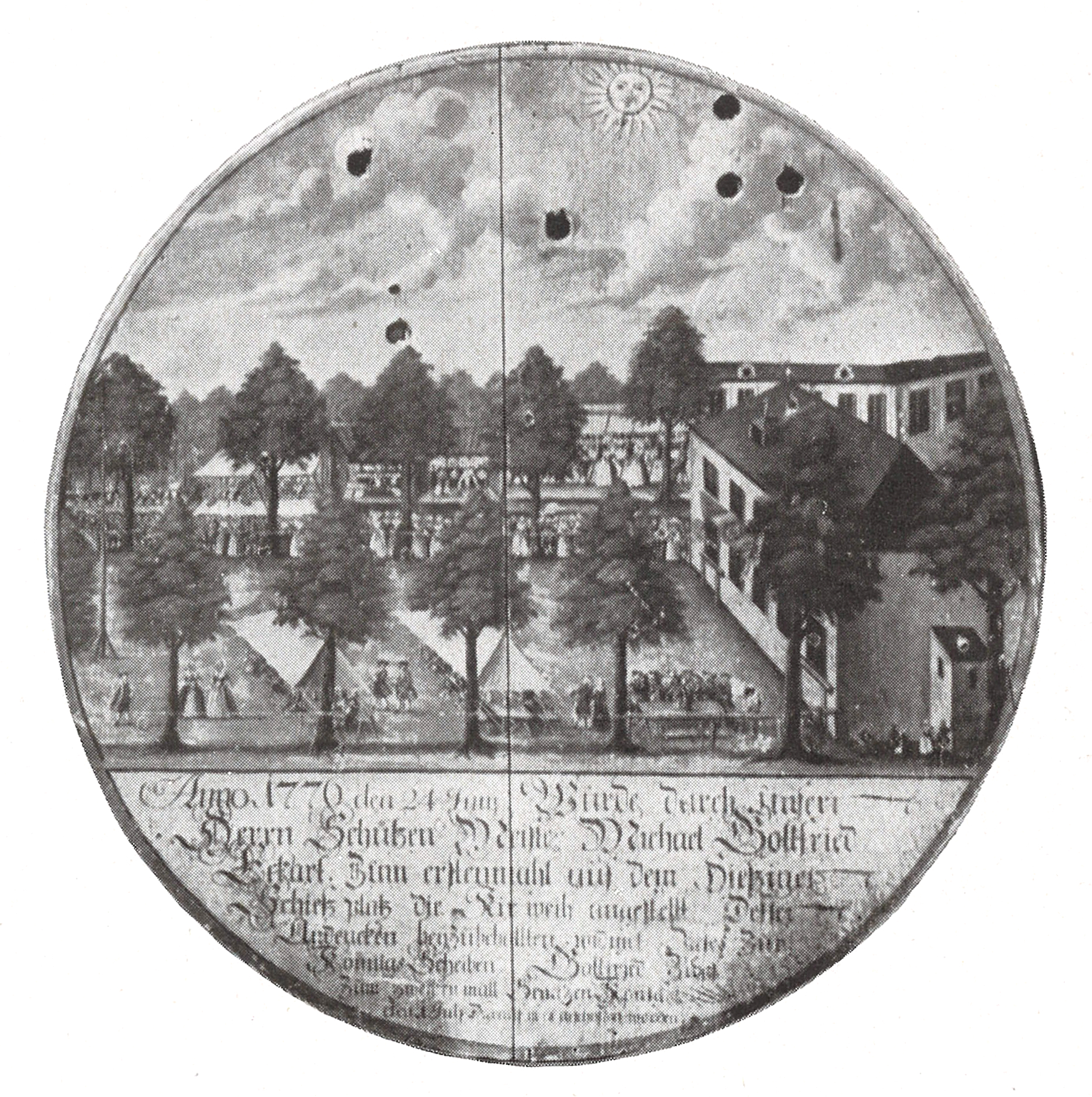 | Beschreibung | Schützenscheibe von 1776 mit Abbildung des alten Schießhauses und der ersten Schießhauskirchweih | ||