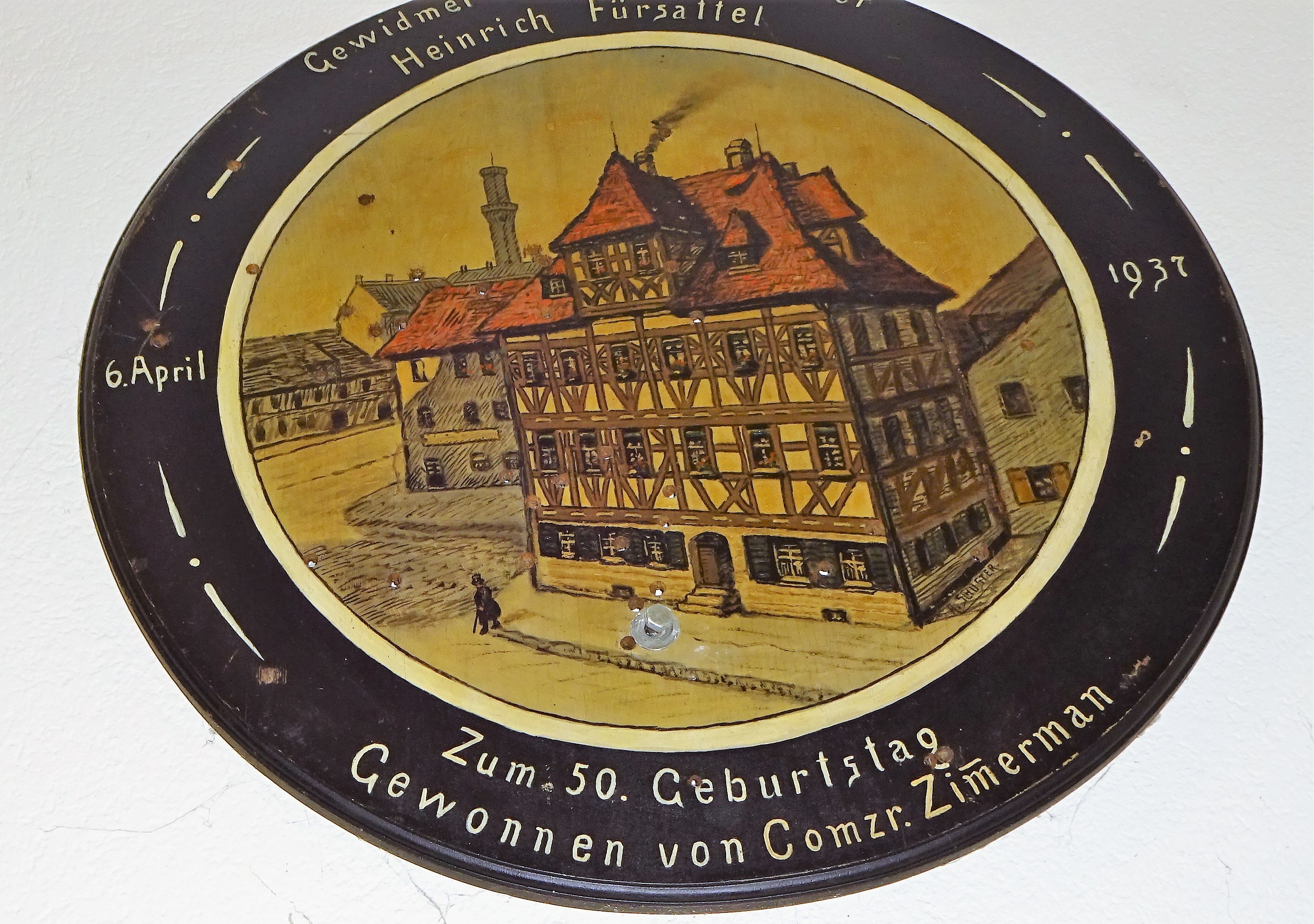 Alte Schützenscheibe Motiv "Zum Tannenbaum von 1937 aus der Gaststätte Schützenhaus Urheber: Heinrich Fürsattel<br>Erstellungsdatum: 6. April 1937<br>Lizenz: cc-by-sa-3.0
