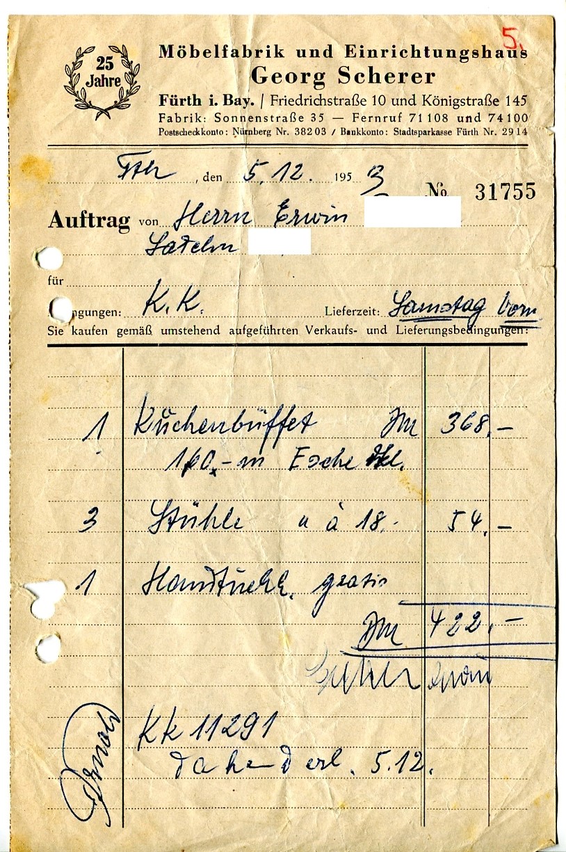 Rechnung vom 05.12.1953 der Firma Möbel Scherer aus der Friedrichstraße 10