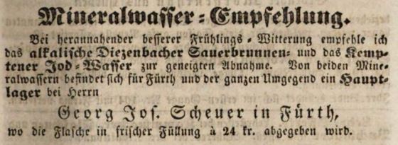| Beschreibung | Werbeannonce für das Mineralwasserlager von Georg Joseph Scheuer, April 1843 | ||