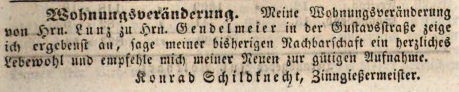 | Beschreibung | Zeitungsanzeige des Zinngießermeisters Konrad Schildknecht, Mai 1843 | ||